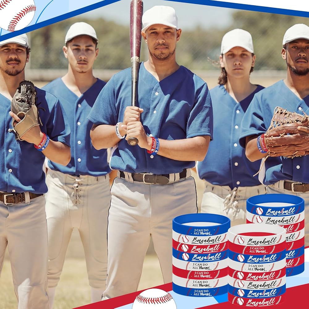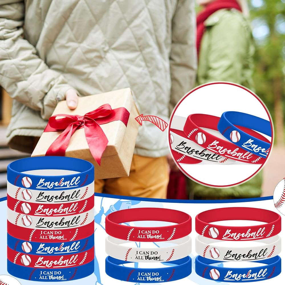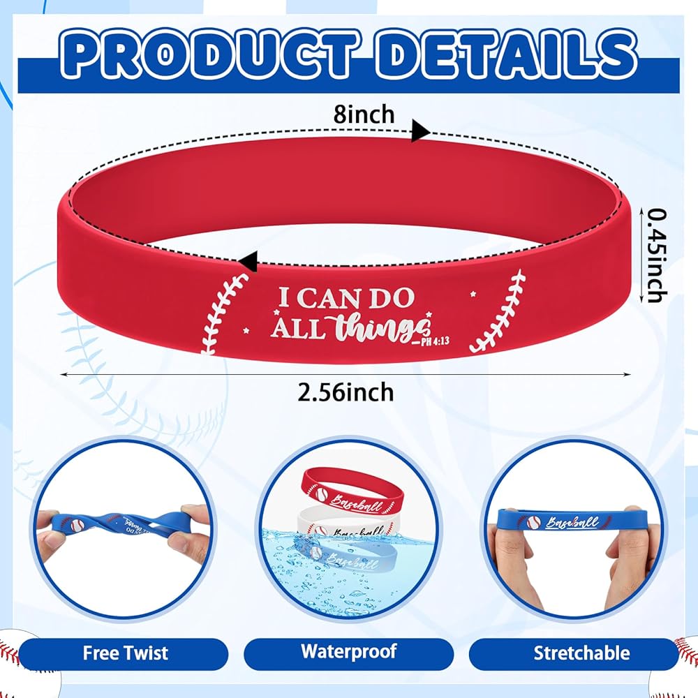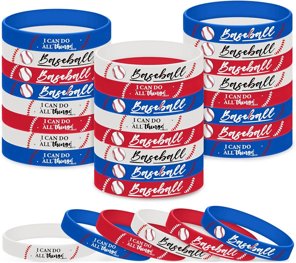 • Vibrant Multicolor Appeal: featuring red blue and white design, 10 of each color, these baseball silicone bracelets stand out with a unique combination of baseball patterns and inspirational bible [I can do all things]; Whether color, each bracelet's vibrant colors enhance their eye-catching appeal, perfectly suiting any playful occasion