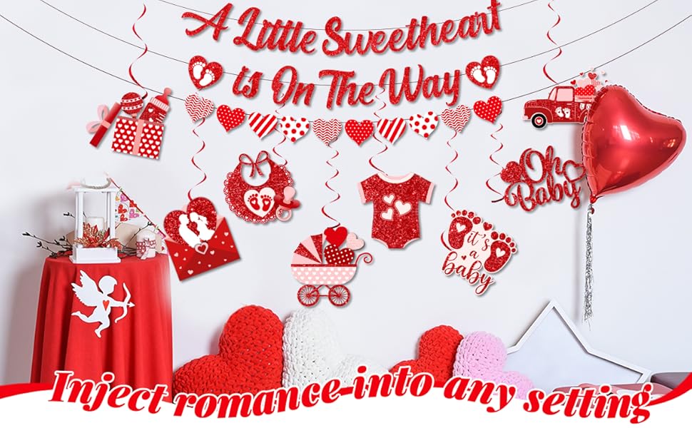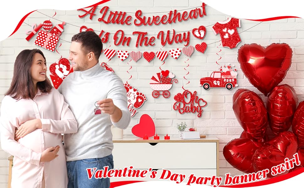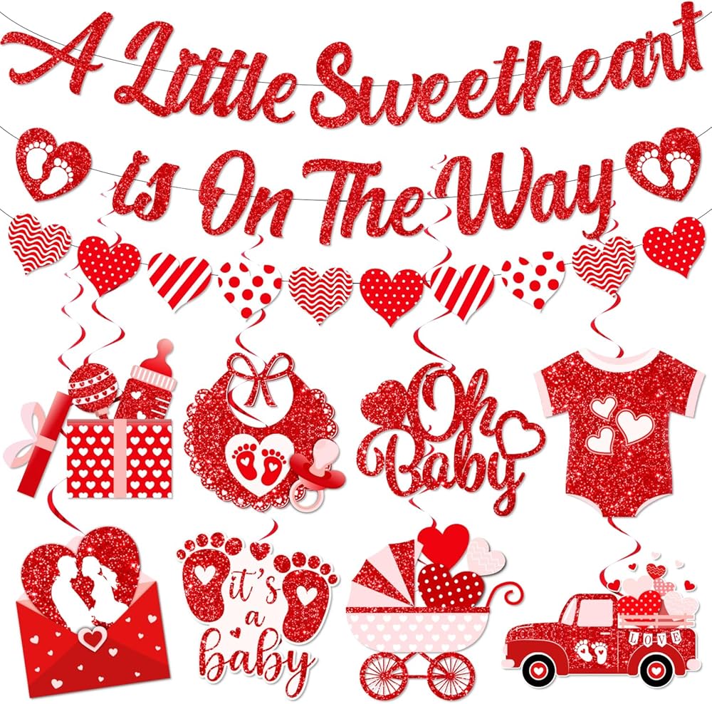 【Valentines Baby Shower Decorations Banner】Our Valentines Day baby shower decorations with 1pc a little sweetheart is on the way banner, 1pc heart baby shower decorations banner,8pcs different designs sweetheart decorations hanging decorations.a little sweetheart is on the way decorations will be a big hit at your baby shower valentine theme party,gives your a joyful party atmosphere.