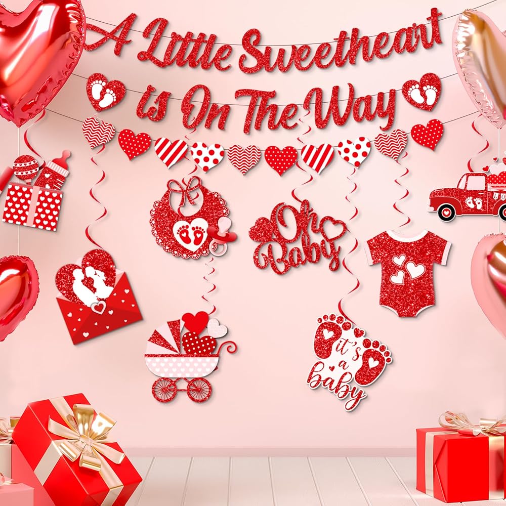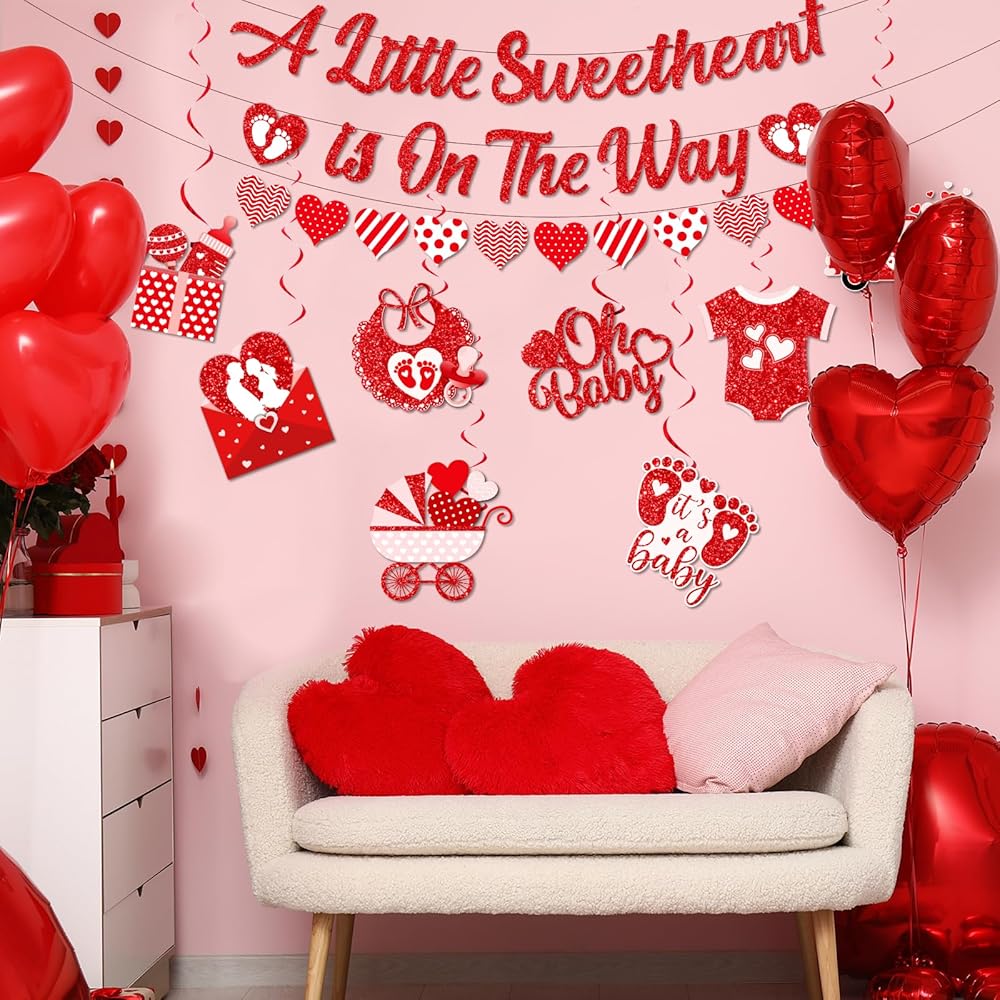 Valentines Baby Shower Decorations, A Little Sweetheart Is On The Way Banner and Red Baby Shower Decorations Hanging Swirls, Sweetheart Decorations for Valentines Day Baby Shower Party