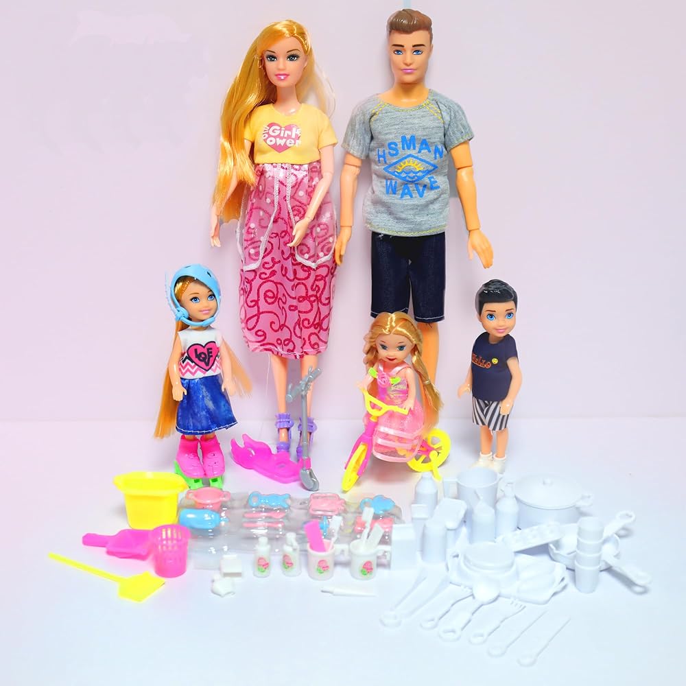 Package Includes: 1 Brown Hair Mommy Doll with a Red Dress, 1 Daddy Doll, 2 Daughters,1Son,1 Baby Boy in Mom's Tummy and 55Accessories Playsets (Refer Picture Shows)