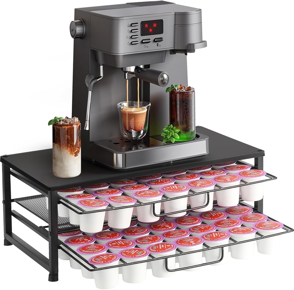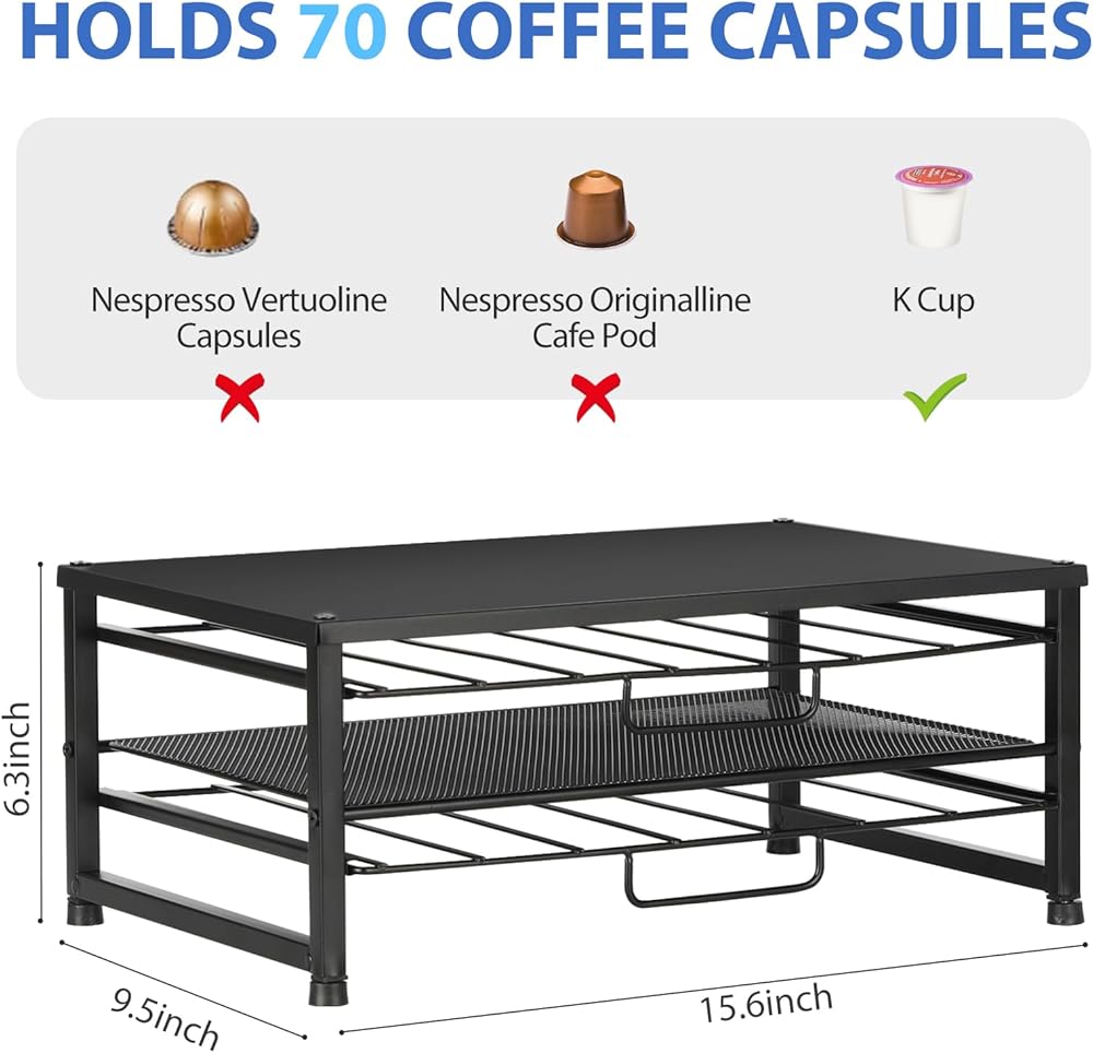 【Large Capacity】 The ECOLOVI k cup holder organizer features two spacious storage drawers that can hold up to 70 coffee pods. The pull-out design allows you to easily access and organize your favorite coffee flavors, keeping your coffee area tidy and organized