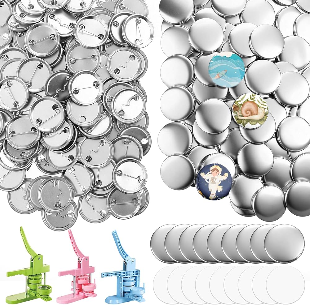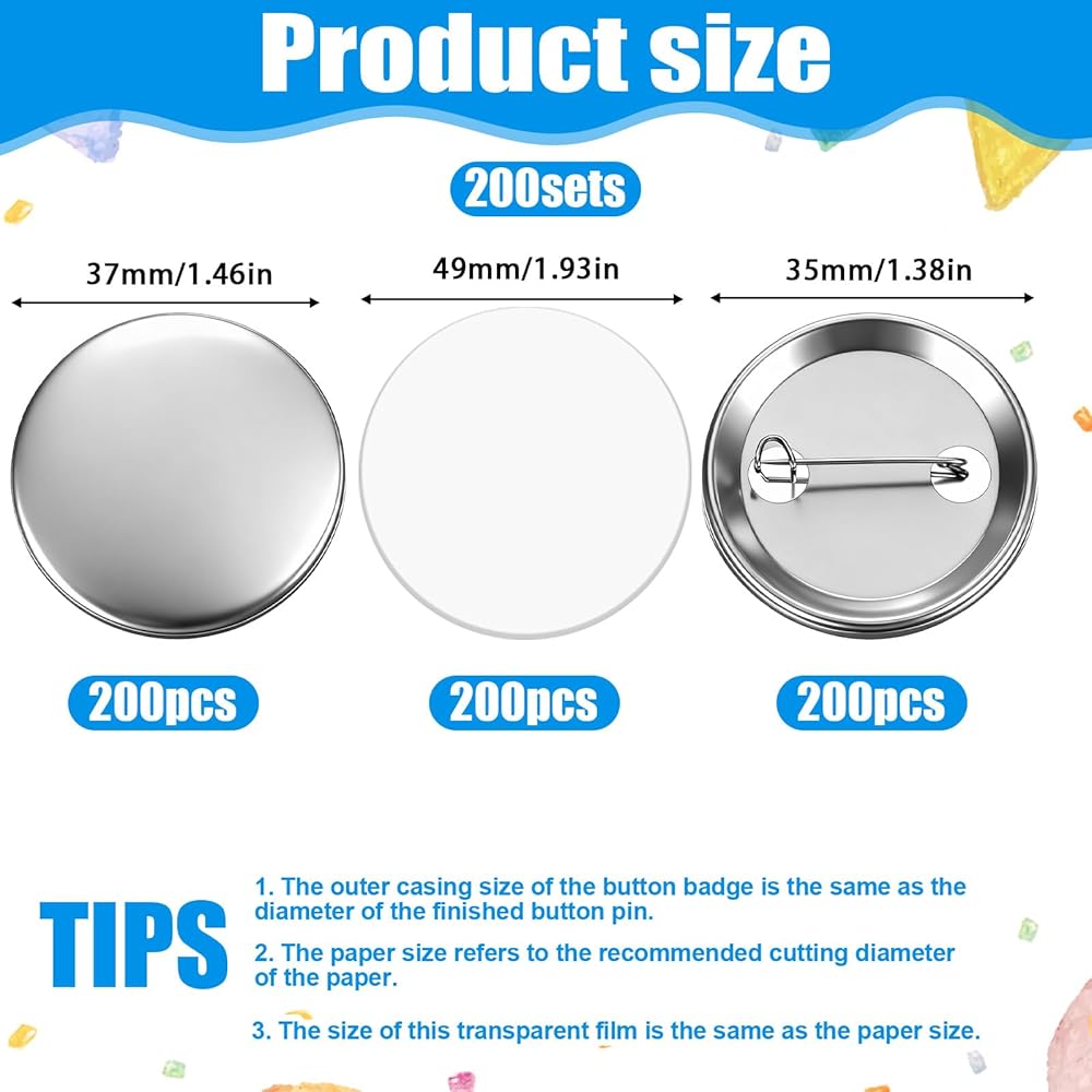 200 Sets 37mm/1.46 Inch Button Maker Supplies Round Badge Parts Blank Pin Back Buttons Parts Metal Pin Badge Kit Includes Metal Shells Back Cover and Clear Film, for Button Maker Machine Pins Makers