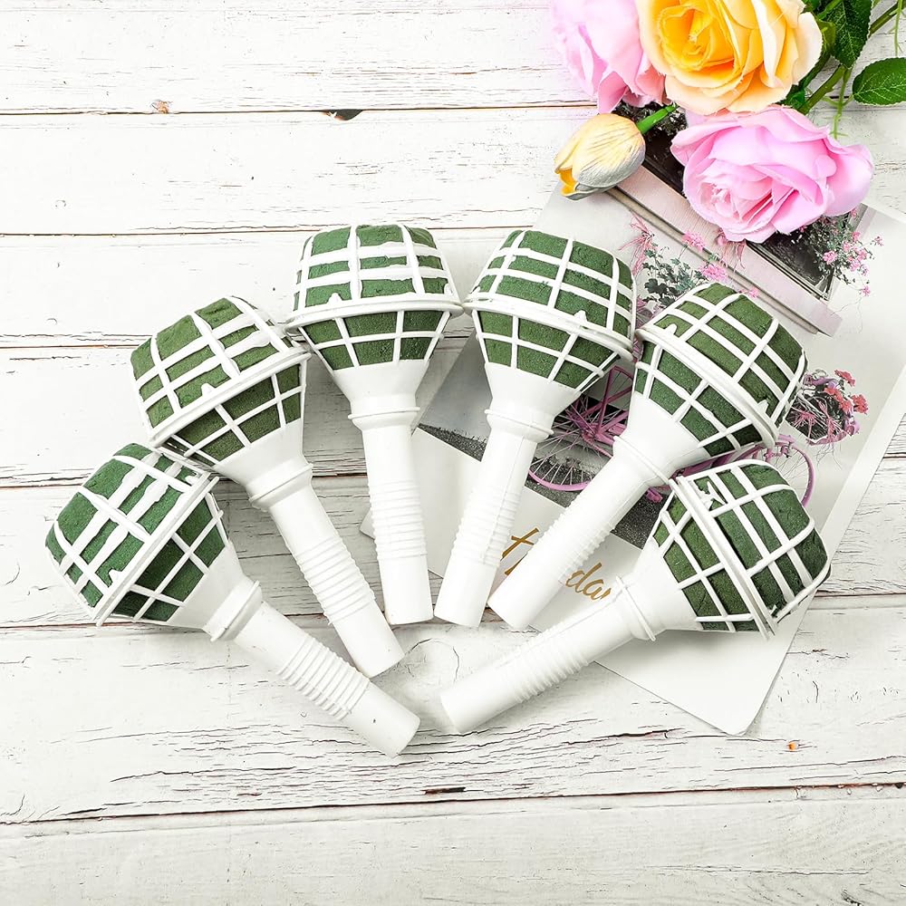 12 PCS Bouquet Holders, Floral Foam Handle with Cage for Fresh & Artificial Flowers, Wedding Bridal Bouquet Supplies for DIY Arrangements (Green Foam, White Handle)
