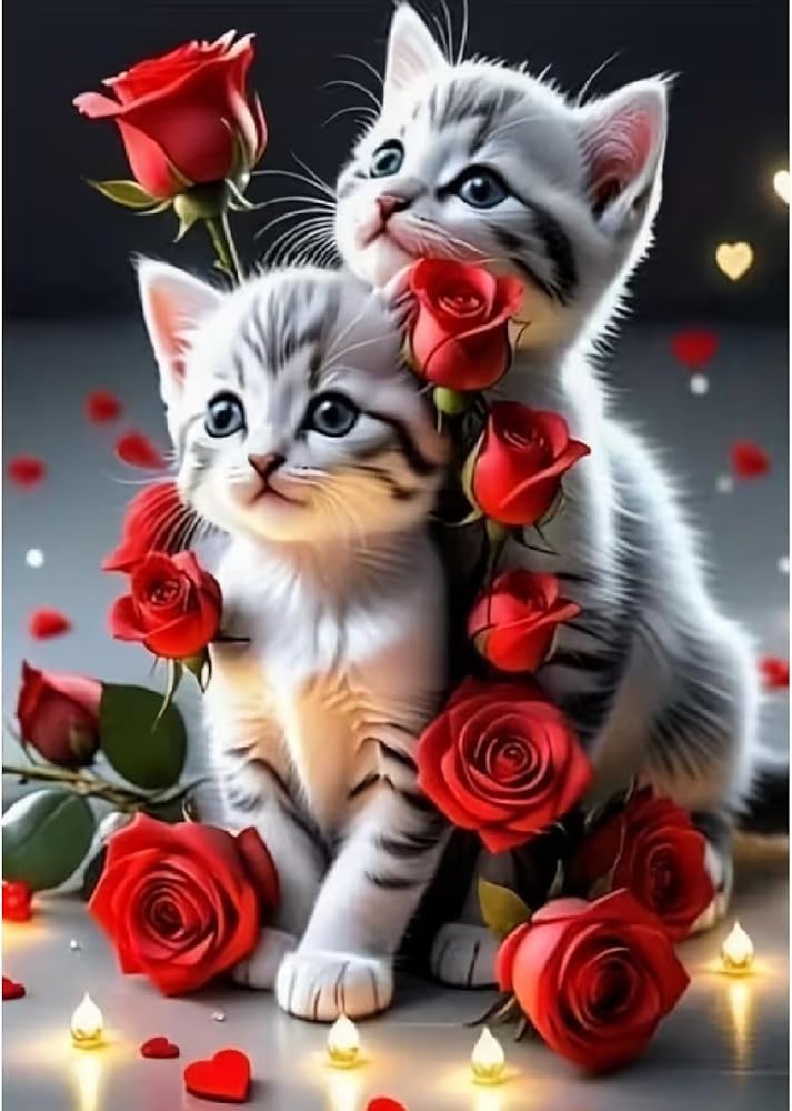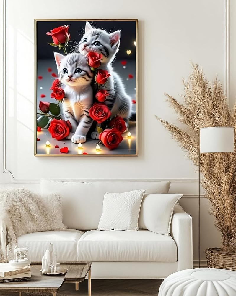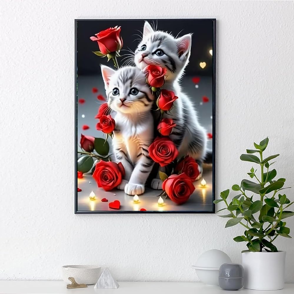 MOMDEDP Cat Diamond Art Kits for Adults, Kitten Rose Flowers Diamond Painting for Adult, 5D Diamonds Painting, DIY Round Full Drill Cats Gem Art Crafts Kit Home Wall Decor Gifts 16x12 inch