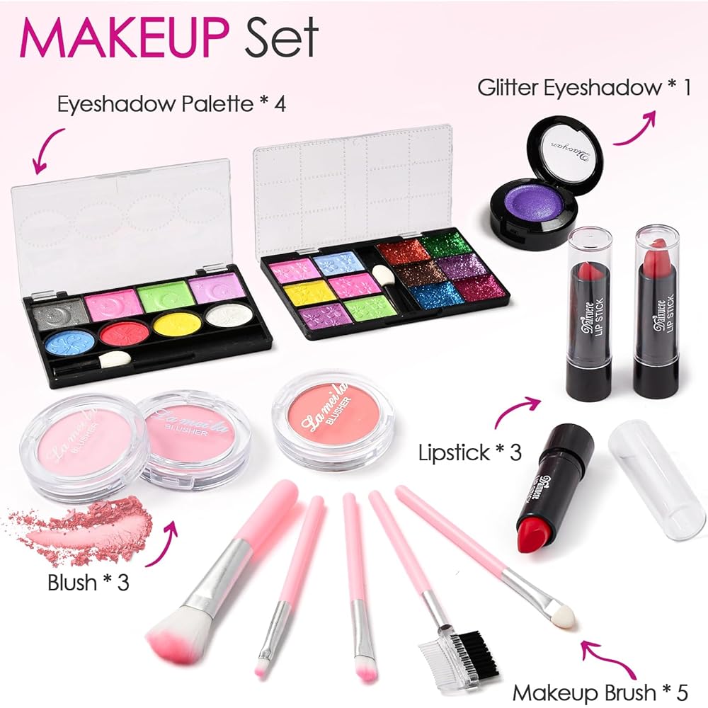 Make Up Starter Kit for Beginners: Beginners always want to try out different makeup effects to find the style that suits them. Our make up set offers cosmetics with 28 colors in total and 4 makeup effects including matte, metallic, glow and glitter. So it is a good choice for beginners who just start trying makeup, as it includes all the cosmetics needed for a complete makeup look with various color & effect options. Kids can try out all kinds of fashion styles with our kids makeup kit