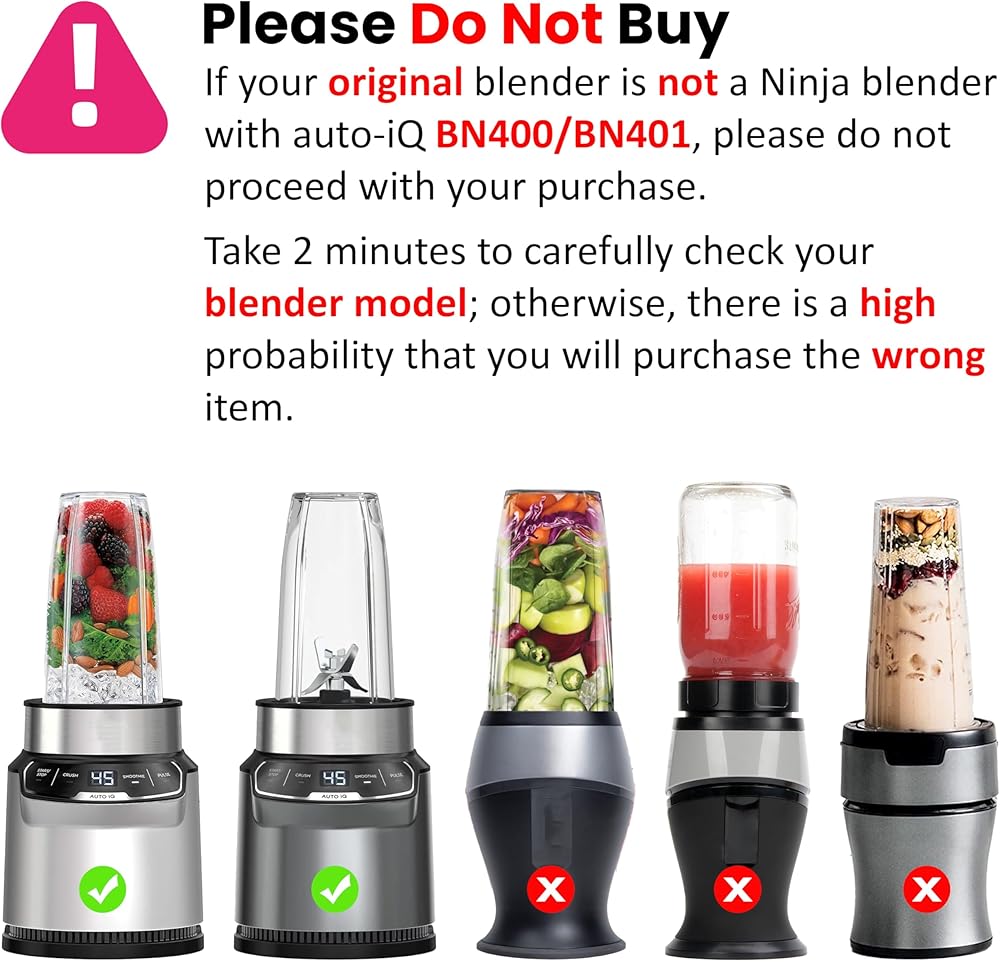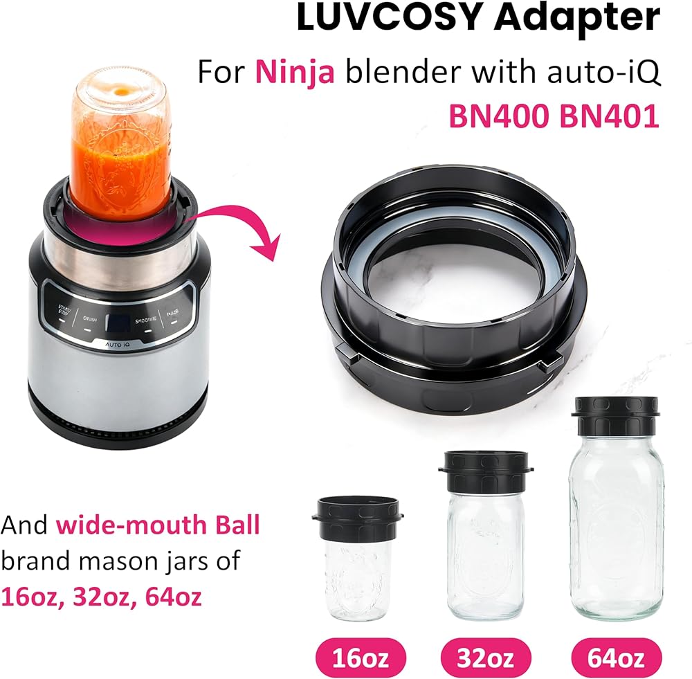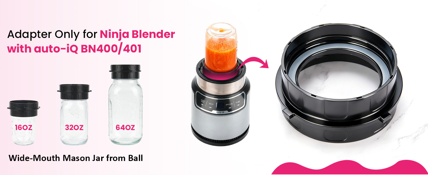 ⚠️ NOTE: This adapter is compatible with the Ninja Blender with Auto-iQ BN400/BN401 and wide mouth Ball brand mason jars, including the 16oz, 32oz and 64oz sizes. Please confirm the model information before purchasing. (Please ensure to tighten the connection before each use for safety and optimal performance.)