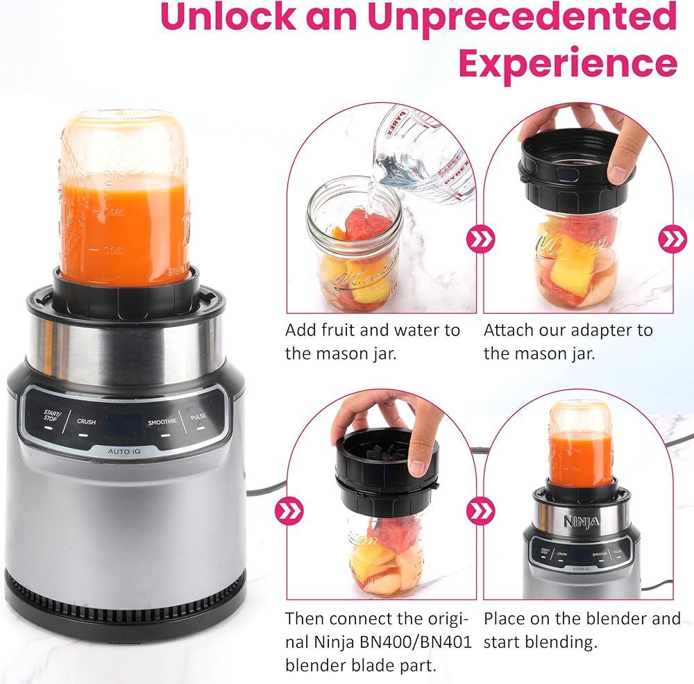 💡INNOVATIVE💡 The adapter is designed to connect Ball wide-mouth mason jars to the Ninja blender with Auto-iQ BN400, BN401, allowing you to directly blend in the glass jar instead of using the original plastic cup.
