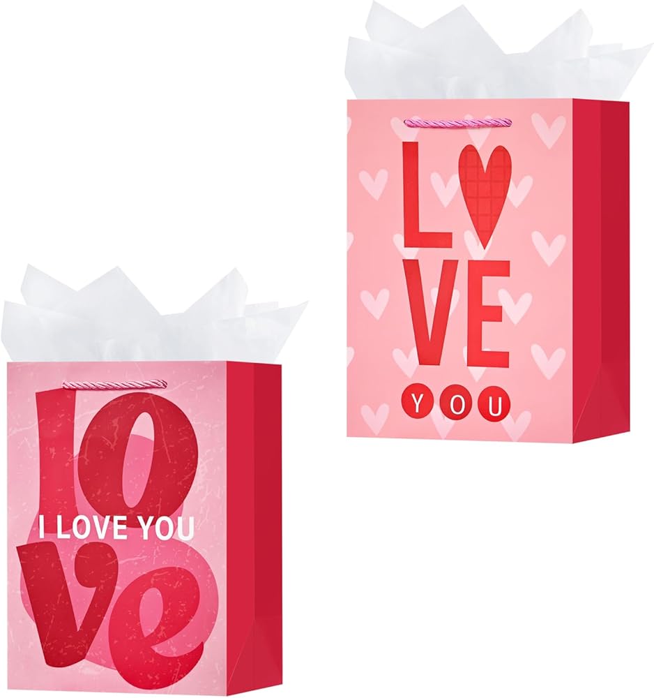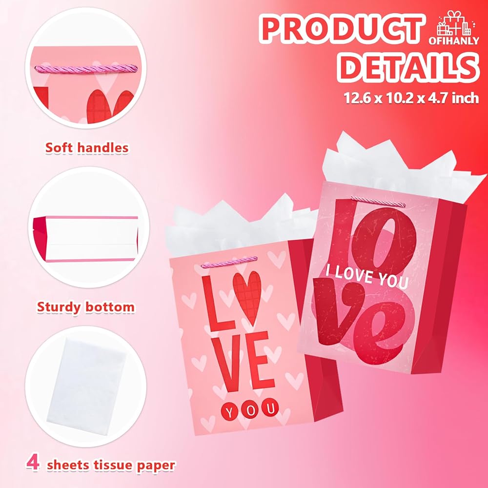 OFIHANLY 2 Pack 12.6" Medium Size Happy Valentine's Day Gift Bags with Handles for Women Her Pink Love You&Heart Paper Gift Wrap Bags with Tissue Paper for Kids