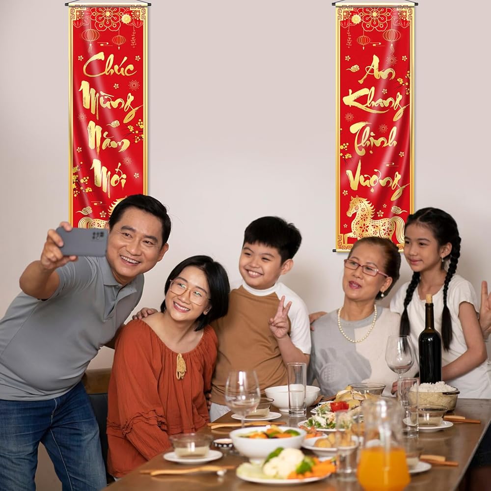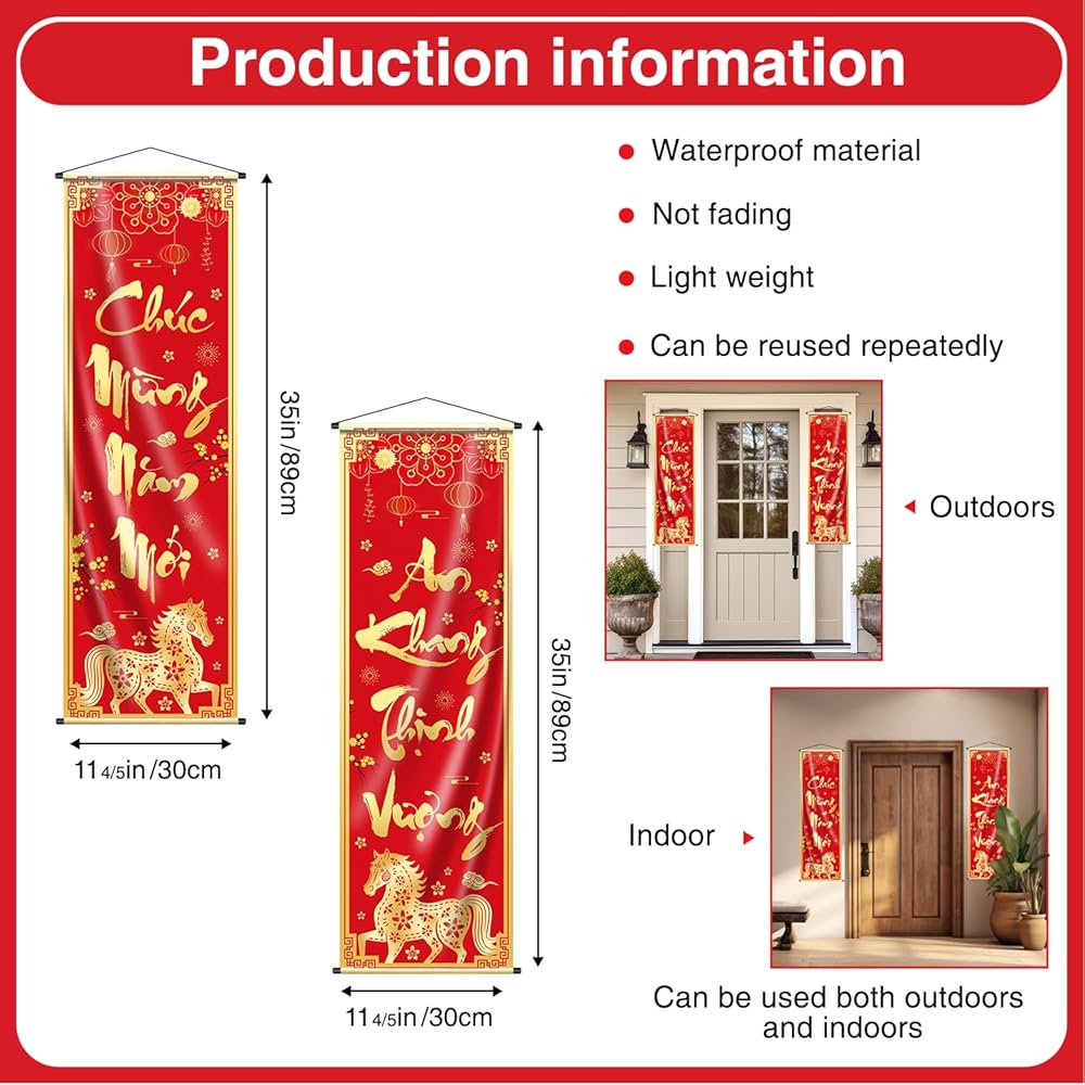 Package includes: the lunar new year decorations porch banner includes a chuc mung nam moi decorations banner. Both in the size of 35" x 11.42" (L x W), the large letter makes it easy to see from a distance and attracts the attention of guests, which is great for tet decor