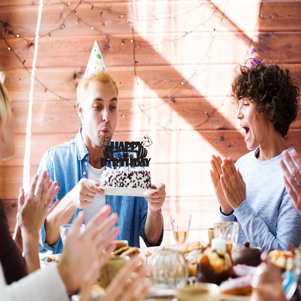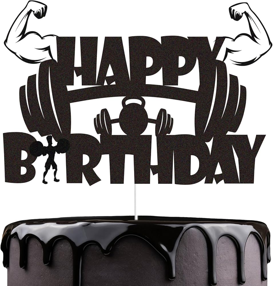 Gym Fitness Happy Birthday Cake Topper Black Glitter Cake Decorations Gym Sports Weightlifting Fit Fitness Barbell Boys Men Themed Birthday Party Supplies