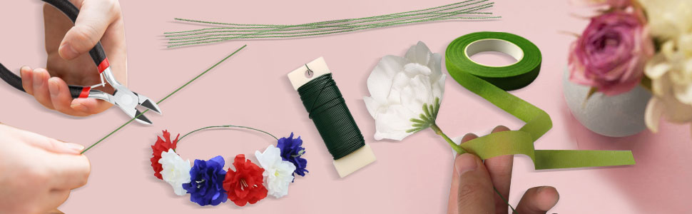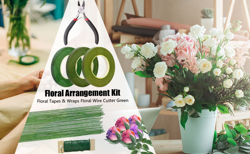FLORAL TOOL KIT - 1 Floral Wire Cutter; 3 Rolls tapes with different color, dark green, medium green and light green; 100 pcs 26 Gauge Green Floral Wire (Length: 36cm, Diameter: 0.45mm); 30m long Paint wire (Diameter: 0.7mm)