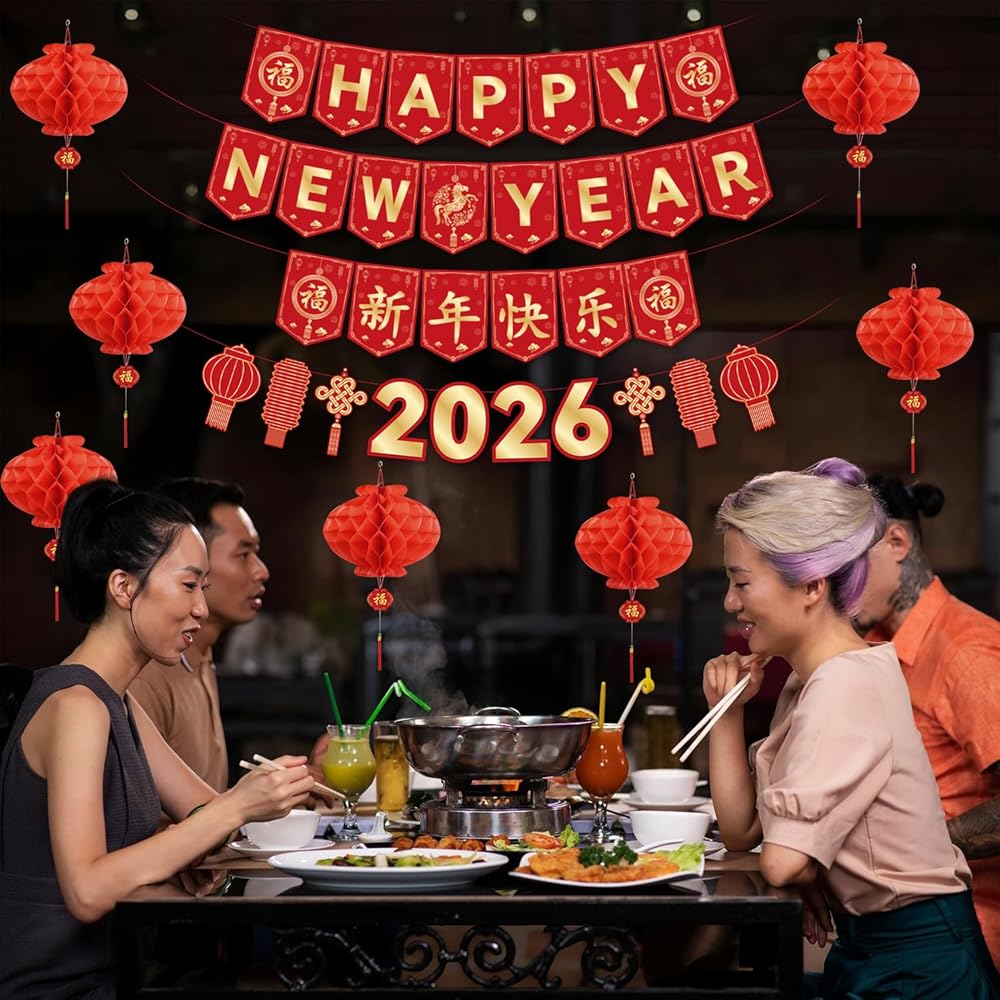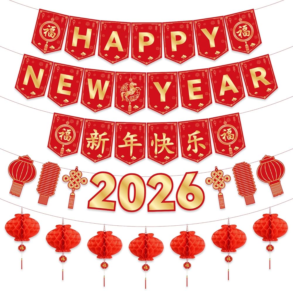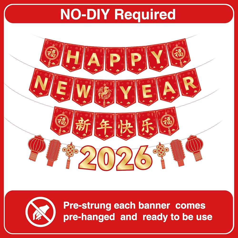 Chinese New Year blessings are coming: These 2026 Lunar New Year decorations include 3pcs banners. Not only do they feature English letters for "Happy New Year," but they also feature Chinese characters for "Happy New Year." The bilingual design and the red lantern banner with a Spring Festival theme will bring New Year's greetings to your party.