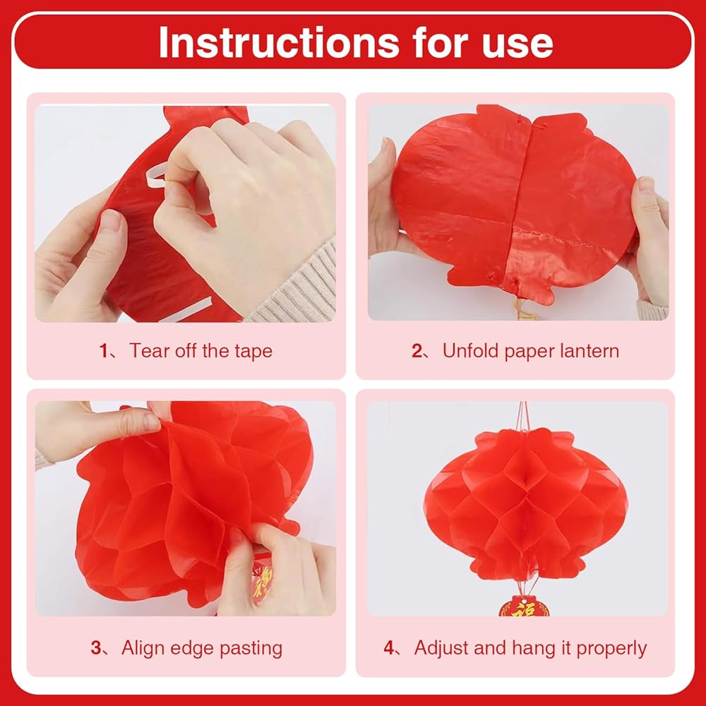 Partial Pre-Assembly: The Chinese New Year banner comes partially pre-assembled to save you time and effort. The red lanterns need to be opened and assembled. Each lantern has a circular ring on top. Thread the ring with red thread to create a beautiful lantern banner. Find the perfect spot in your home—whether it's your living room, front door, or ceiling—and hang it up. You'll spend less time preparing and more time enjoying the festivities.