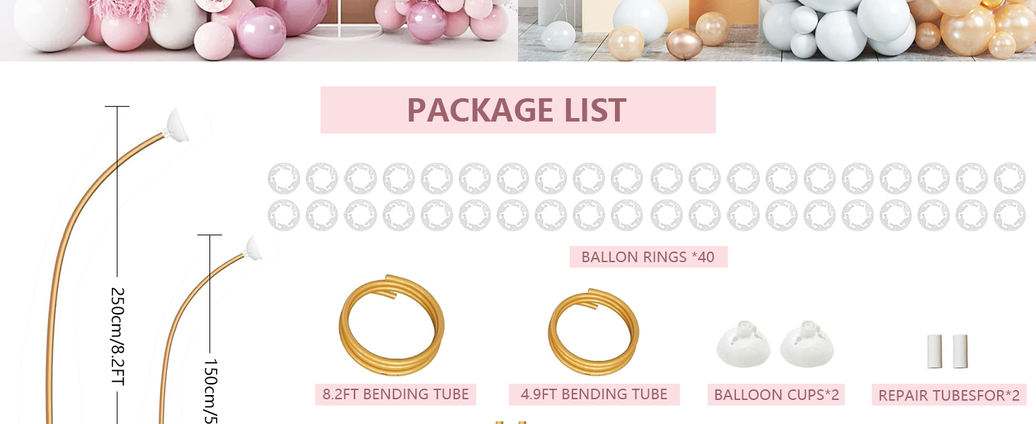 Balloon Arch Kit Include: Half arch stand kit includes 40 balloon flower clip, 2 balloon cup, 2 water bag, 2 base, 2 PVC hard tube, 2 PVC hose (8.2 feet and 5 feet), 1 balloon pump