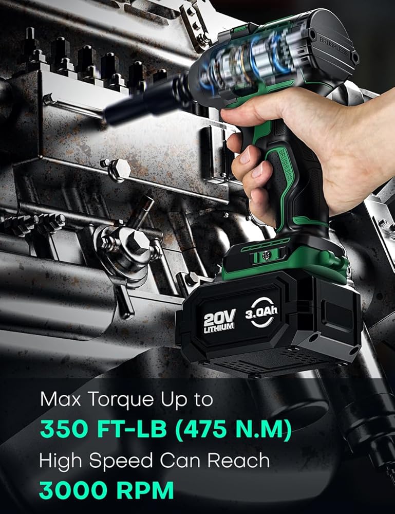 【𝐁𝐞𝐚𝐬𝐭 𝐅𝐨𝐫 𝐑𝐞𝐩𝐚𝐢𝐫𝐢𝐧𝐠】Feel the commanding power in your hands as the cordless impact wrench unleashes a staggering 350 ft-lbs (475N.m) of torque and speed up to 3000 RPM, effortlessly tightening stubborn bolts and nuts during automotive repairs, making the 1/2 impact gun perfect for medium and heavy-duty applications.