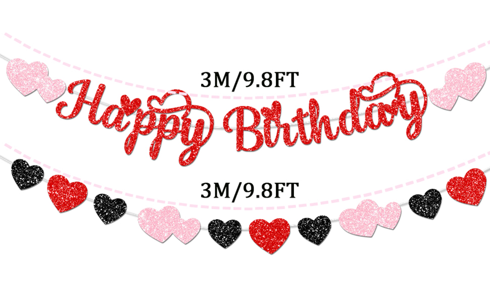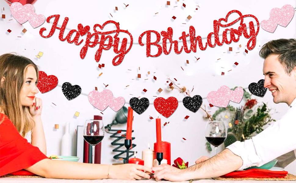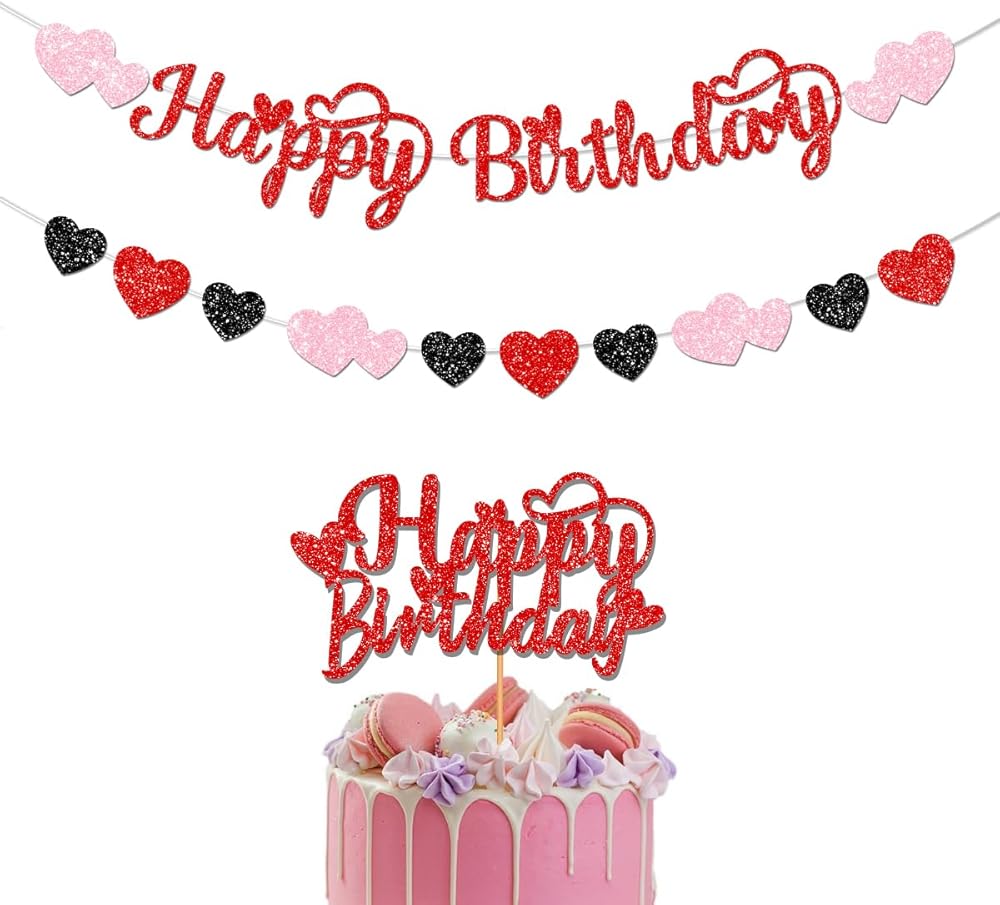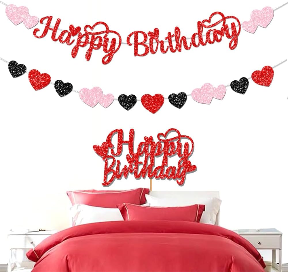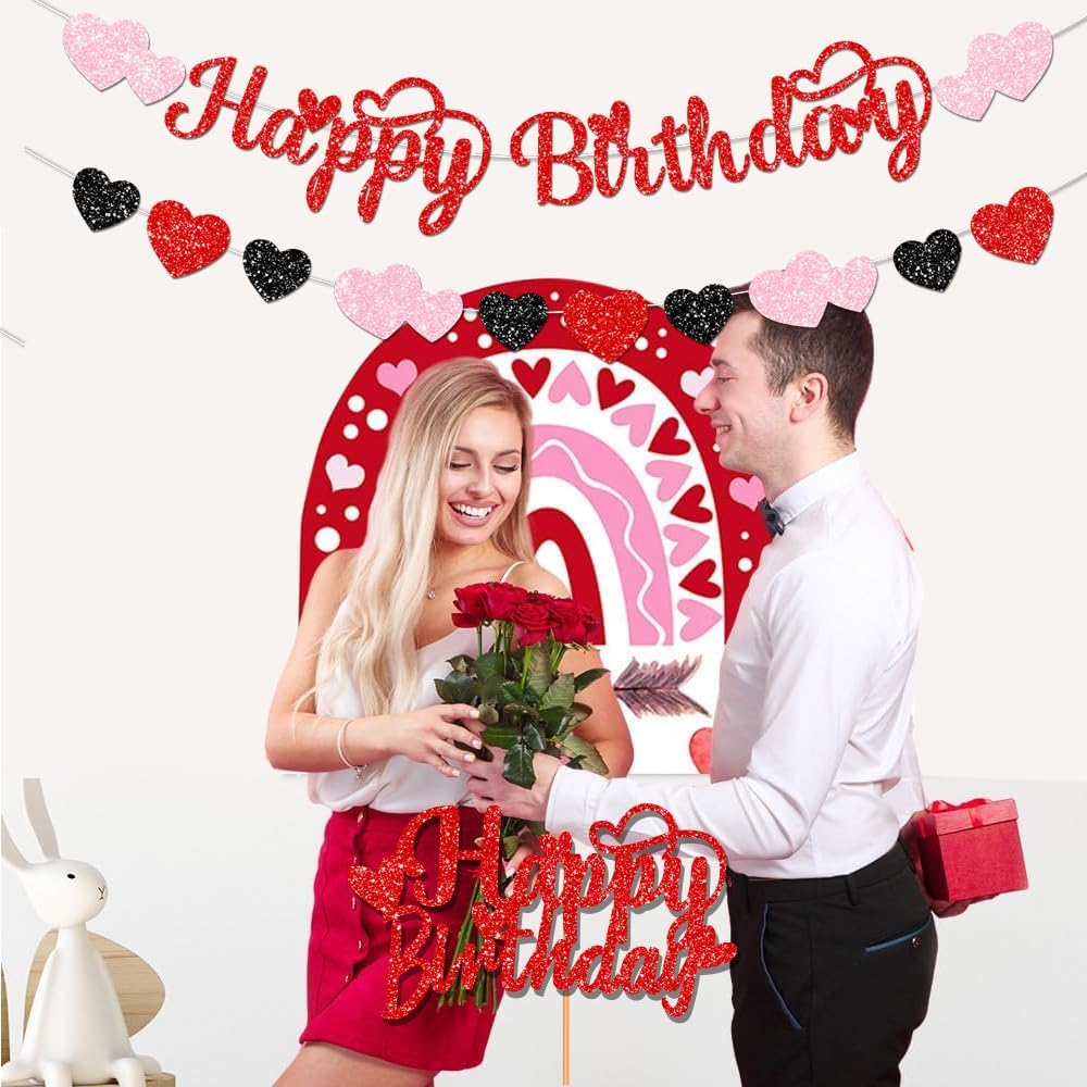 1. Glitter happy birthday valentine decorations Package includes 1 set red Glitter Happy birthday banner and 1 set red glitter hearts garland and glitter Valentine's Day Birthday cake topper, making it especially fitting for a Valentines birthday theme