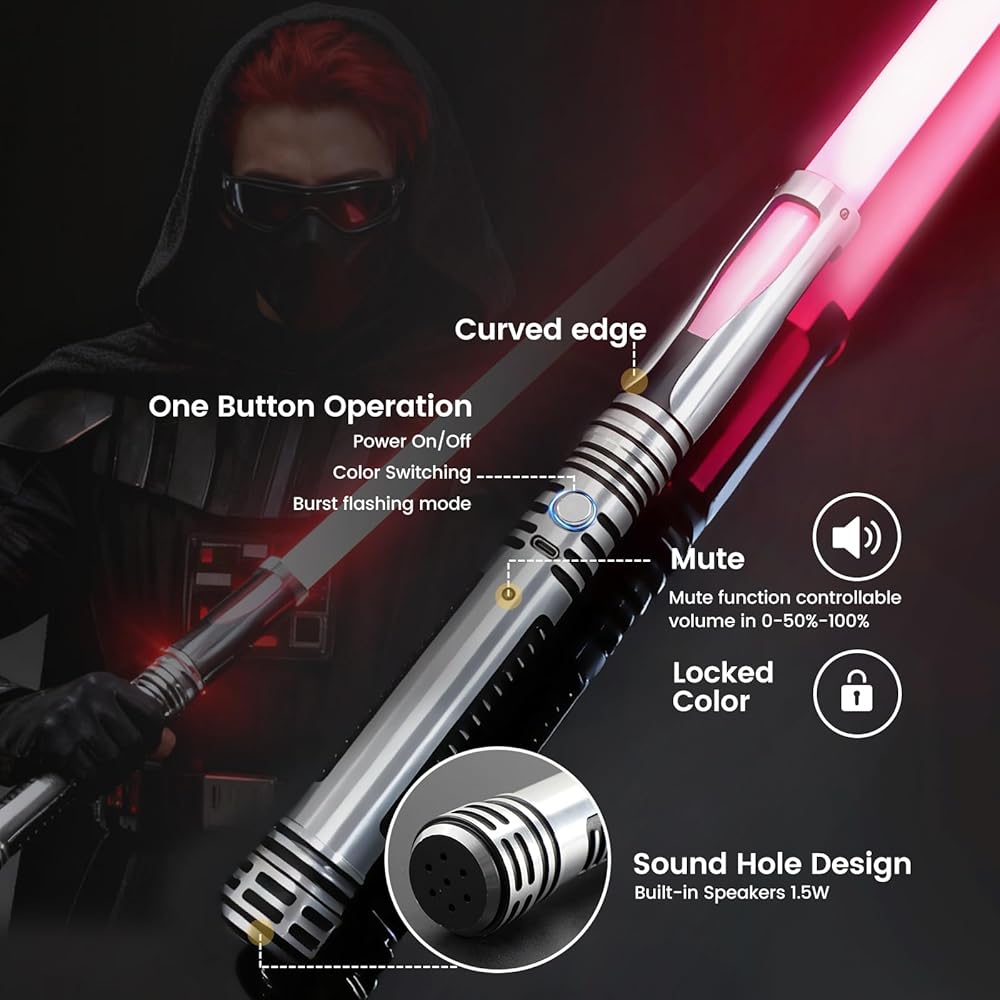 Immersive FX Sound Effects & Adjustment Control--Experience the galactic battle with realistic humming, clashing, and swinging sound effects. The built-in high-quality motion sensor activates dynamic sounds with every move you make, delivering a truly immersive and interactive role-playing experience.Our dueling saber can make a loud hitting sound and flash during a confrontation. If you get annoyed by the sounds, you can press the volume button to reduce 30% by each press untill silent mode