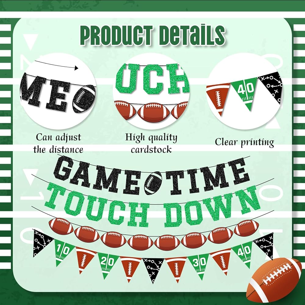 Skip the hassle—our pre-strung banner arrives ready on a sturdy 9.8 ft strand. Hang it instantly for birthdays, watch parties, or any gridiron gathering! Pre-strung & ready means zero DIY. Letters stay secure thanks to small punch holes, preventing sliding and keeping your message perfectly aligned, even at angles—no adjustments needed. Vibrant hand-designed art features bold fonts and eye-catching green pendants for standout flair, saving you time while elevating the atmosphere. Crafted from durable & reusable rugged cardstock, it withstands wear and folds easily for storage, offering endlessly versatile use on mantels, windows, or as a photo backdrop. Beautiful printed patterns ensure it's the perfect decorative touch for any football celebration.