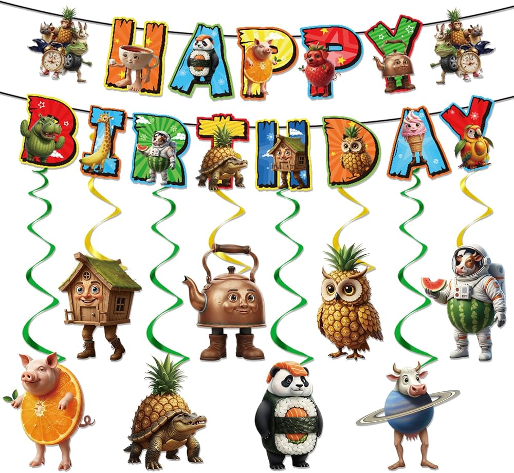 Italian Brain Rot Birthday Decorations, 10PCS Tung Tung Tung Happy Birthday Pre-Strung Banners with Hanging Swirls Party Decorations, Fun Themed Decor Supplies for Celebration