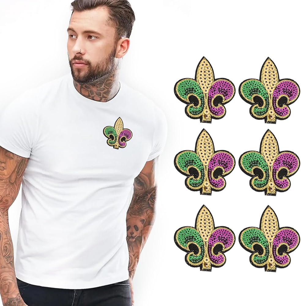 6 Pcs mardi gras Iron On Patches Set, Purple Gold Green Sequin, mardi gras Patches Iron On Fleur De Lis Applique Transfers Fit for Clothing Hats DIY Craft, Carnival Party Accessories