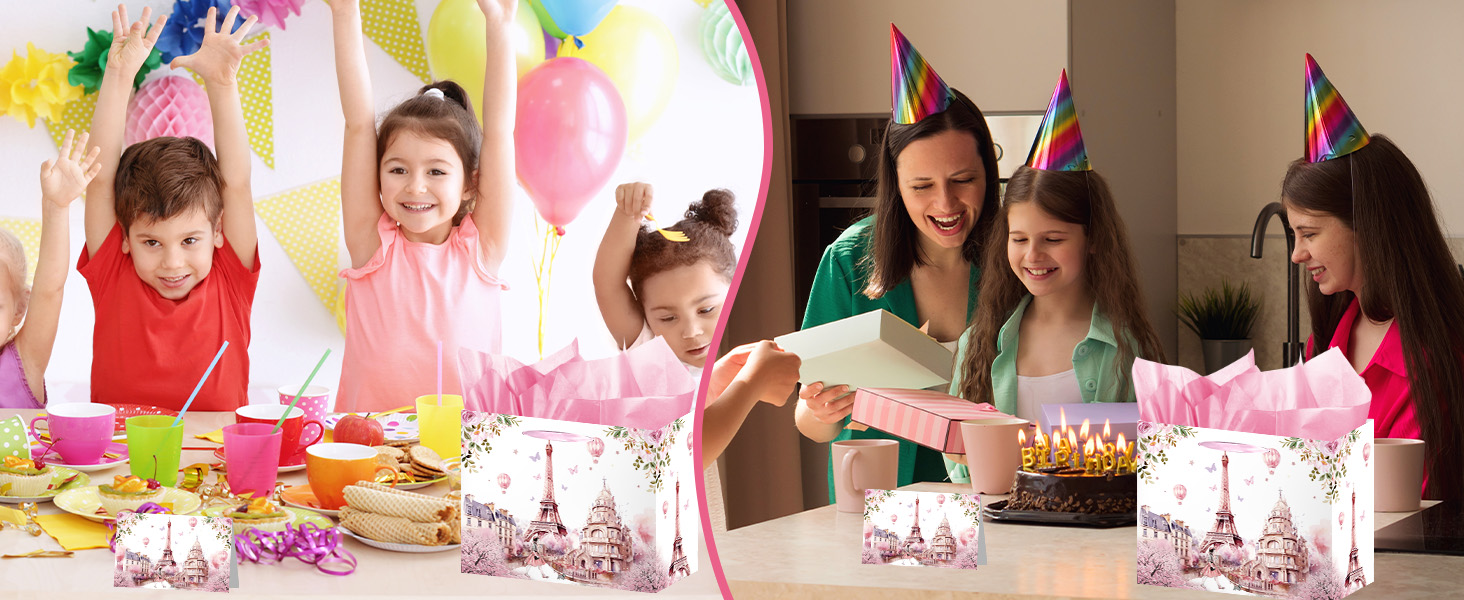 Paris Themed Party Decorations: Gift bag to decorate girls and women's birthday, anniversary and other occasions, with flower, Eiffel Tower prints on it, will make their party more special