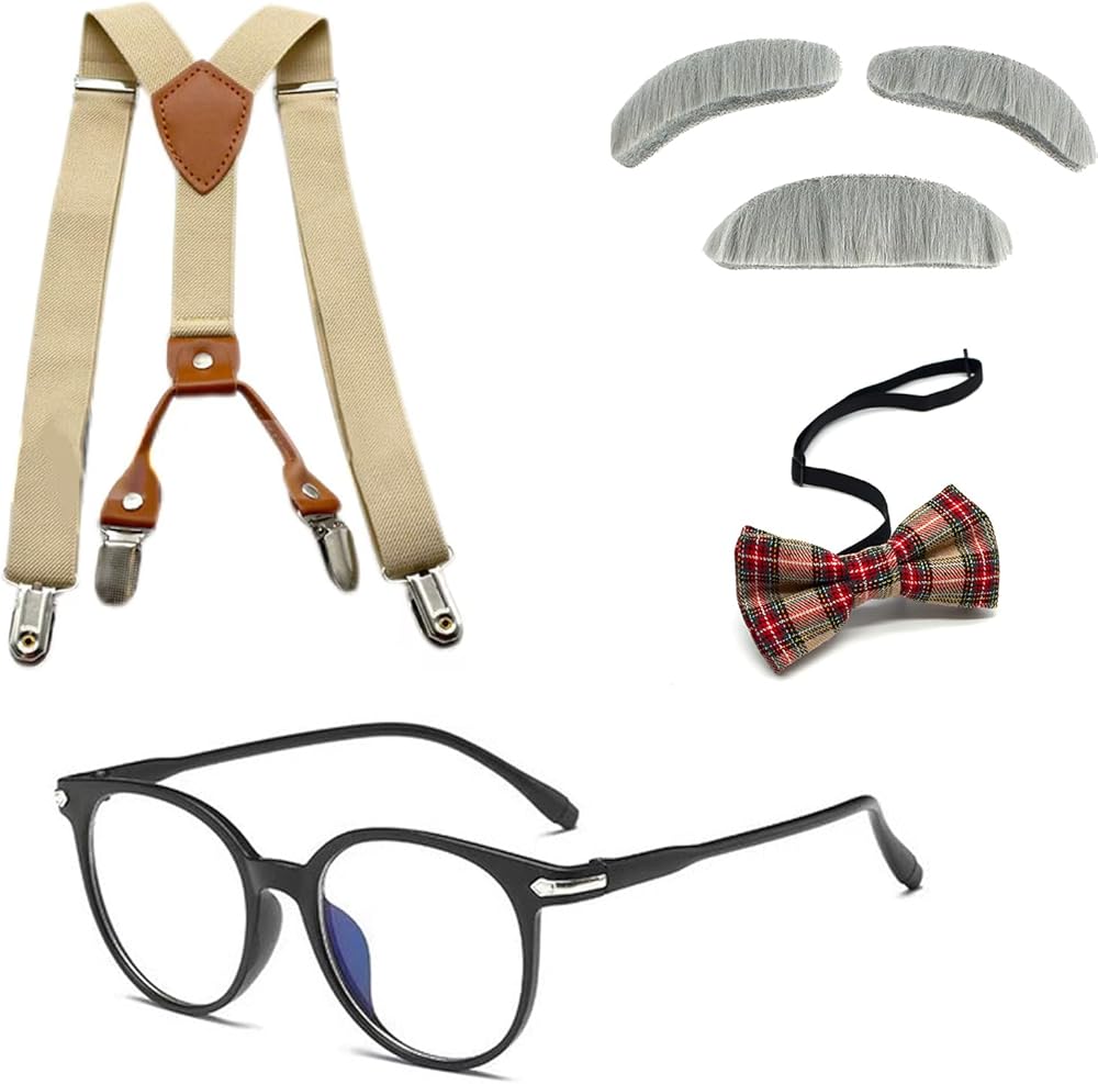 Complete Old Man Costume for Kids: This all-in-oneold man costume for boys set includes everything needed for a classic old man costume: vintage-style glasses, thick gray fake eyebrows, a matching fake beard, adjustable elastic suspenders, and a textured bow tie. All core accessories are included for a complete old people costume role-playing experience.