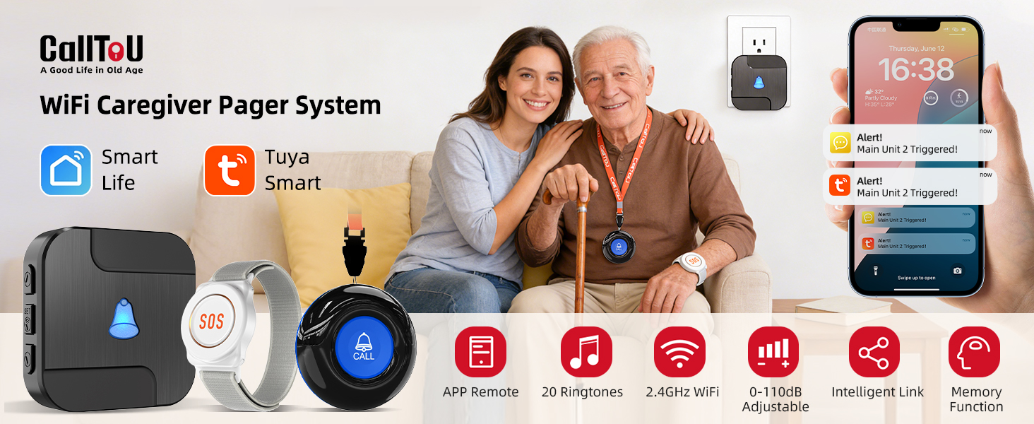CallToU Wi-Fi Wireless Caregiver Pager Call Button for Elderly at Home, APP Emergency Alert Fall Help System for Seniors, Patients/Disabled Monitoring at Home