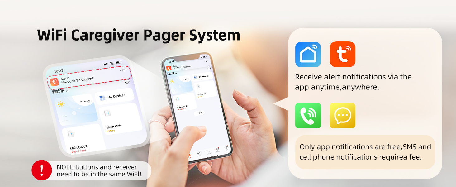Wireless APP Caregiver Pager: The WIFI wireless caregiver pager use 433MHz technology for a 328ft /100m range, penetrating walls and doors, suitable for most homes; The Wireless Receiver connects easily to home Wi-Fi for smart global access. Note: Only supports 2.4G Wi-Fi, not 5G.