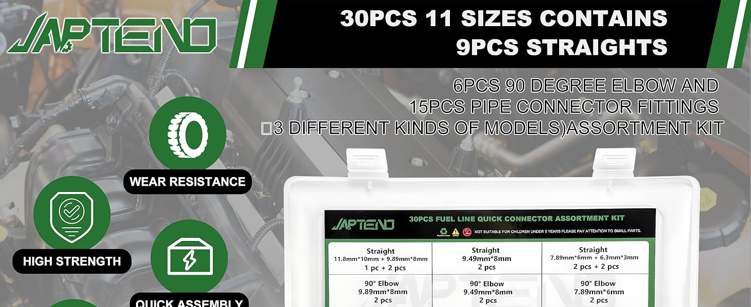 Products: 11 size fuel line connector fittings; Straights connectors - 11.8mm x 10mm&9.89mm x 8mm&9.49mm x 8mm&7.89mm x 6mm&6.3mm x 3mm; 90 Degree Elbow connectors - 9.89mm x 8mm&9.49mm x 8mm&7.89mm x 6mm; Straight pipe connectors - 9.89mm x 8mm& 9.49mm x 8mm&7.89mm x 6mm.