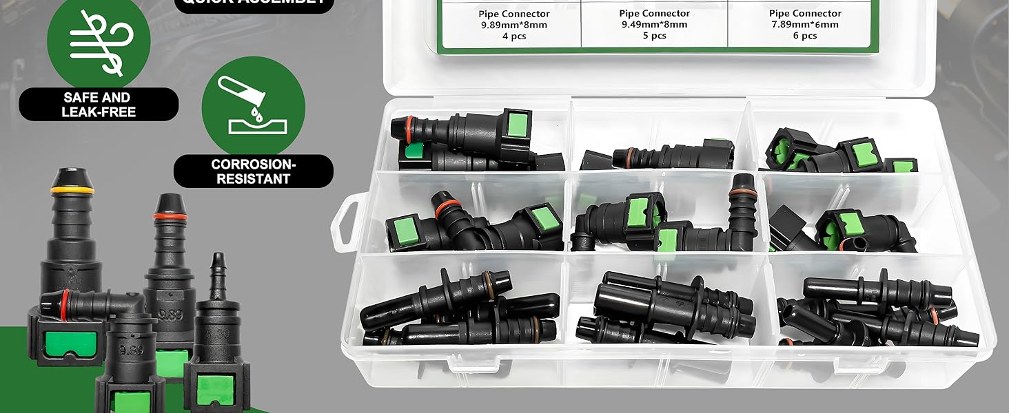 Plastic Storage Container: Includes a durable and lightweight plastic storage container that provides a clean, organized space, makes fuel line connectors easy to sort and find, and provides cushioning and protection for connectors, reducing damage caused by collisions and squeezes.