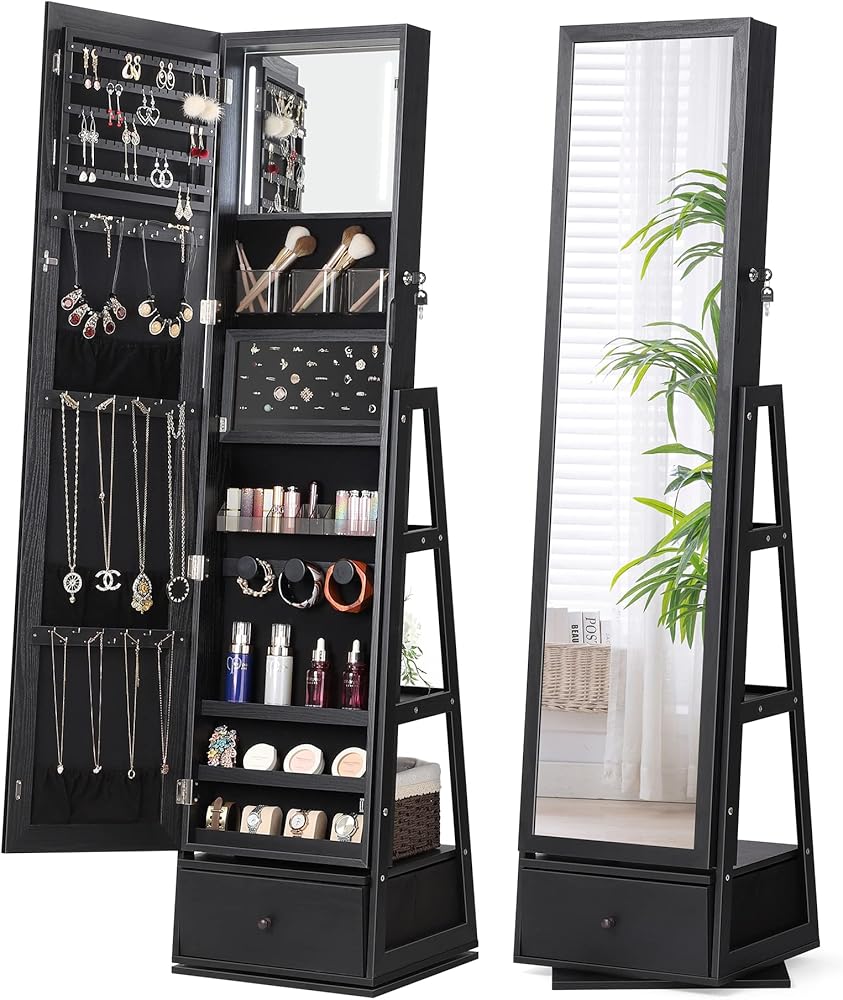 [4 in 1, Space Saver] You will get a jewelry organizer, full length mirror, vanity mirror, large foldable storage drawer and shelves, and stable metal hooks to hang your keys/belts/bags! This Nicetree Jewelry organizer can easily become a stylish showpiece and storage superhero
