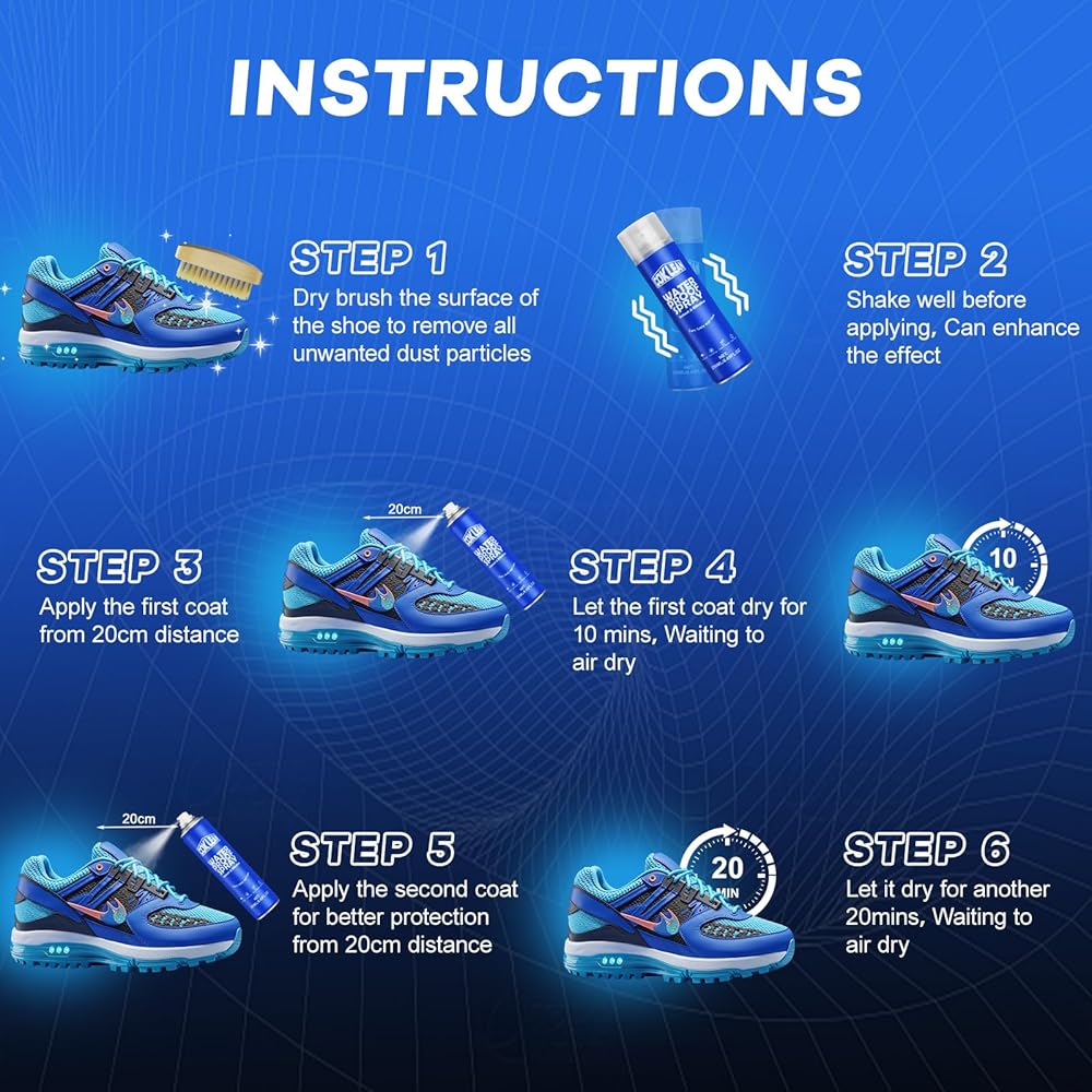 Shoe Waterproof Spray Long-Lasting: In a well-ventilated area, Please shake evenly before use, 2 coats are enough for your spray to create a water-repellent and stain-resistant coat, Wait for 10 minutes to dry between each layer. Let your shoes dry at least 20 minutes before wearing. the stain and water repellent provides durable, long-term protection, Reapply every 4weeks or after every cleaning.