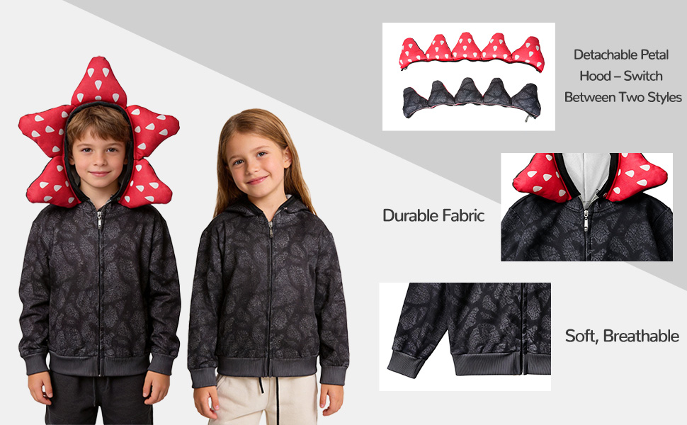 Detachable Petal Hood Design – Style That Changes with You.This zip-up outerwear features a creative petal-style hood that can be attached or removed as needed.Wear it with the hood for a playful, eye-catching look, or detach it for a clean and simple jacket style—one piece, multiple ways to wear.