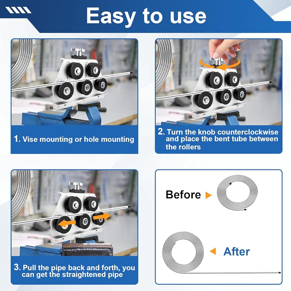 Easy to operate: Anchor the brake line straightening tool using mounting holes or a vise clamp. Adjust the pipe roller spacing to fit the tubing dimensions, then pull the pipe back and forth to achieve a straightened tube