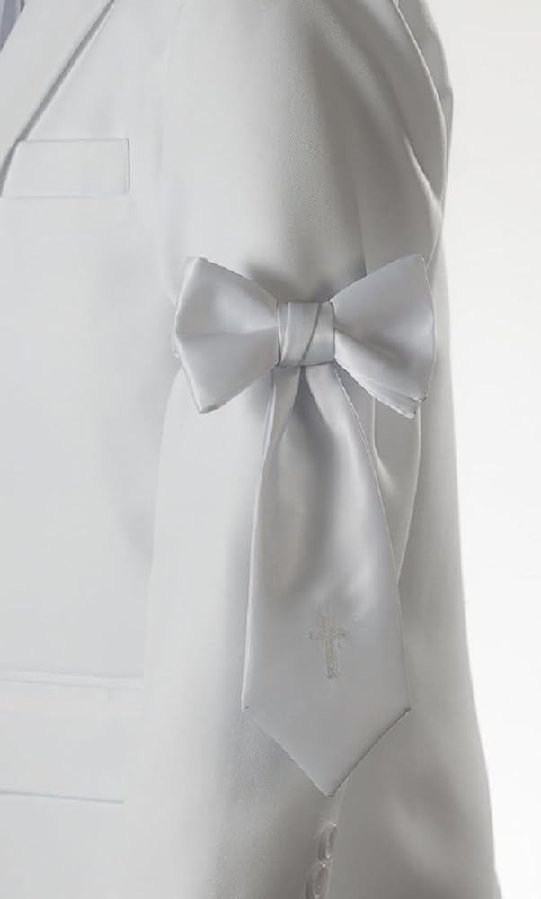 DESCRIPTION: This traditional first holy communion armband is a beautifully designed of a white polyester satin. This traditional first holy communion armband is crafted with an elastic strap the slides on over the jacket sleeve. Accented with a beautiful embroidered religious cross. The stretch of the band allows a comfortable fit for all sizes. This armband is available in a boys one size fits all - bow is 4” height, 5” width, streamers 7” length and the overall length is 10”. Band stretches 8' to 15”. To preserve this handcrafted armband, please gently spot clean with a damp cloth or dry clean as needed. Use a warm iron if needed. This high quality armband is handcrafted in the USA. Our communion armband is perfect for first holy communion, christenings, blessings, baptisms, weddings, and so many more of your special celebrations!