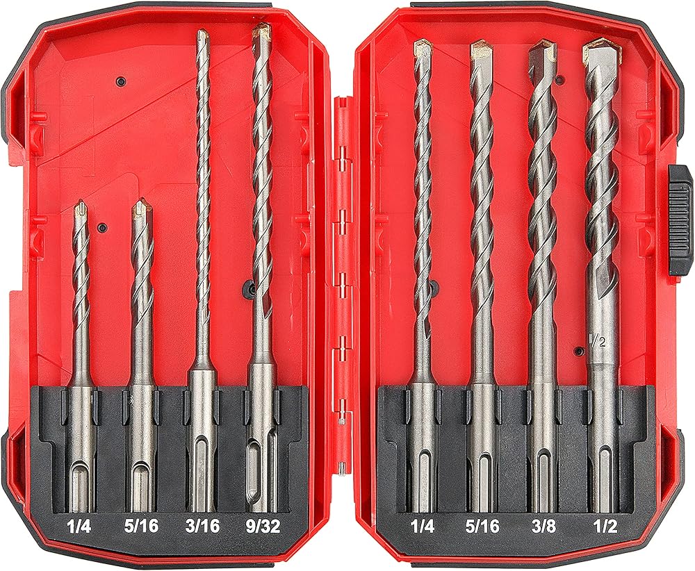 [Specifications and Packaging]: 8pcs sds hammer drill bit set.Include size:1/4 X 4-inch, 5/16 X 4-inch, 3/16 X 6-inch, 9/32 X 6-inch,1/4 X 6-inch, 5/16 X 6-inch, 3/8 X 6-inch, 1/2 X 6-inch all in plastic case.