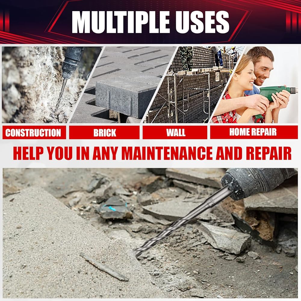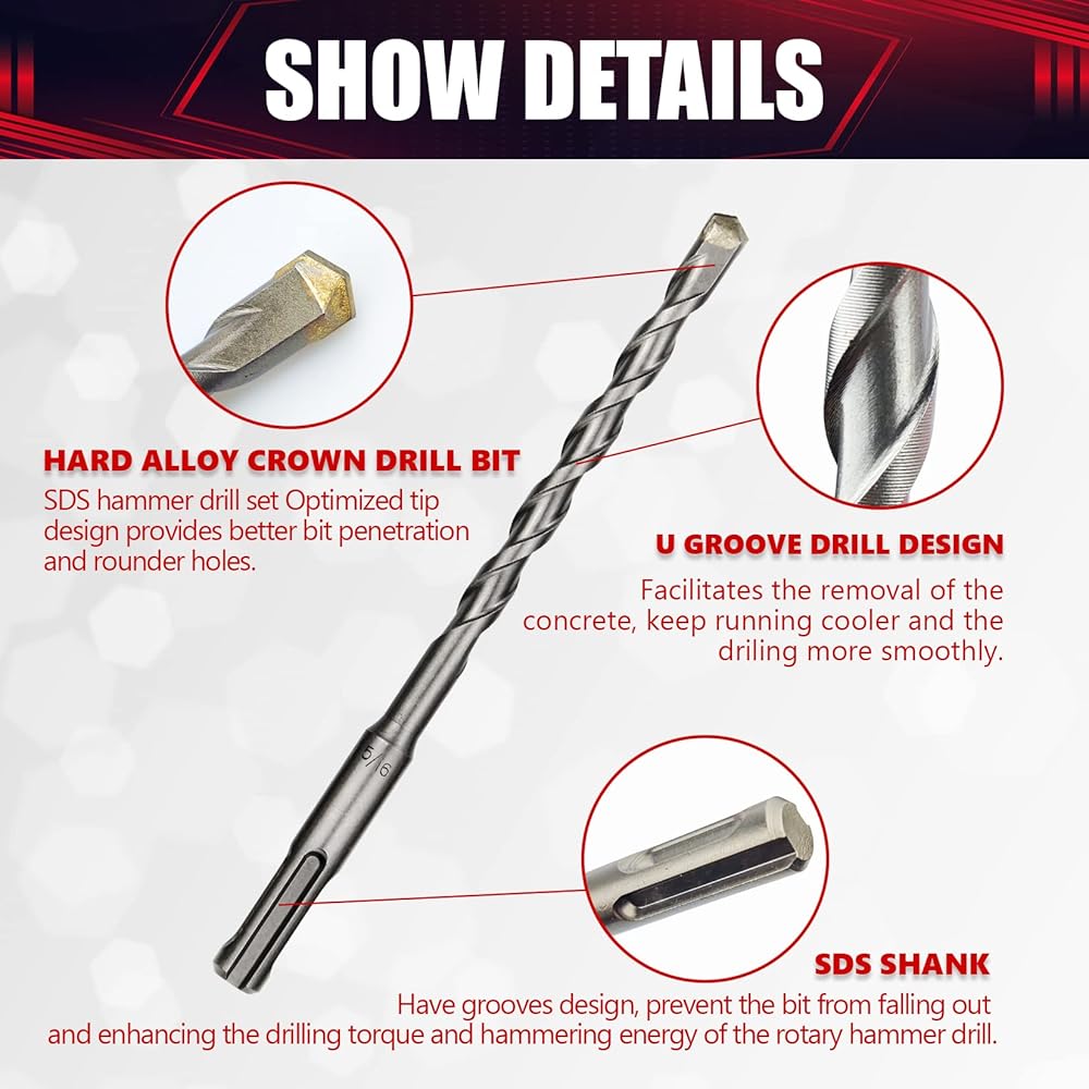 [Special Flute Design]: Concrete drill bit set wider and deeper U-shaped flute design cleans debris out fast for easier, efficient drilling, work time longer.Grooves on sds plus shank - the shank has two types of grooves (total of four). The smaller grooves fix bit in the chuck. The larger grooves allow bits slipping in the chuck when working, enhancing the drilling torque and hammering energy.