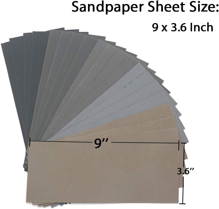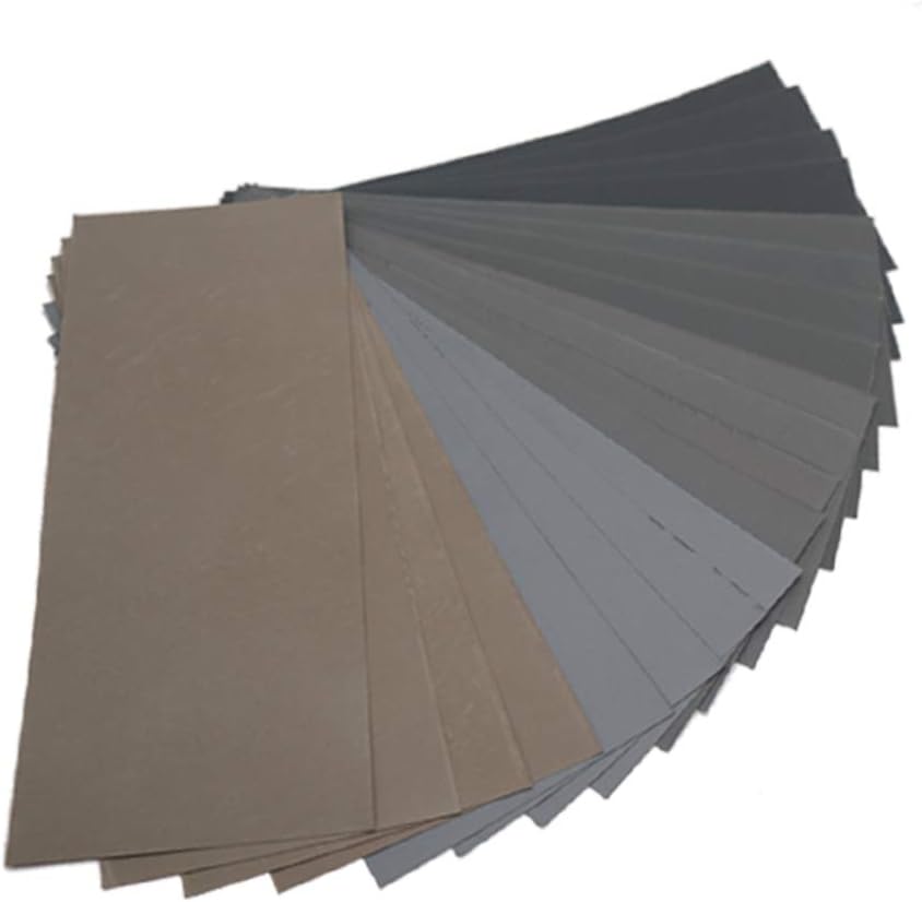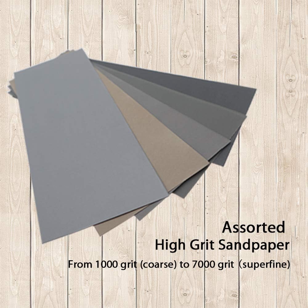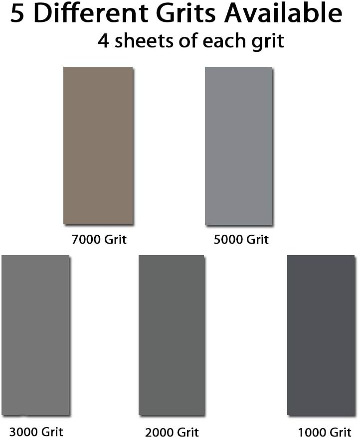 Great selection of varying grits: 5 different grits available, 4 sheets of each grit: 1000/2000/3000/5000/7000, total 20 sheets.