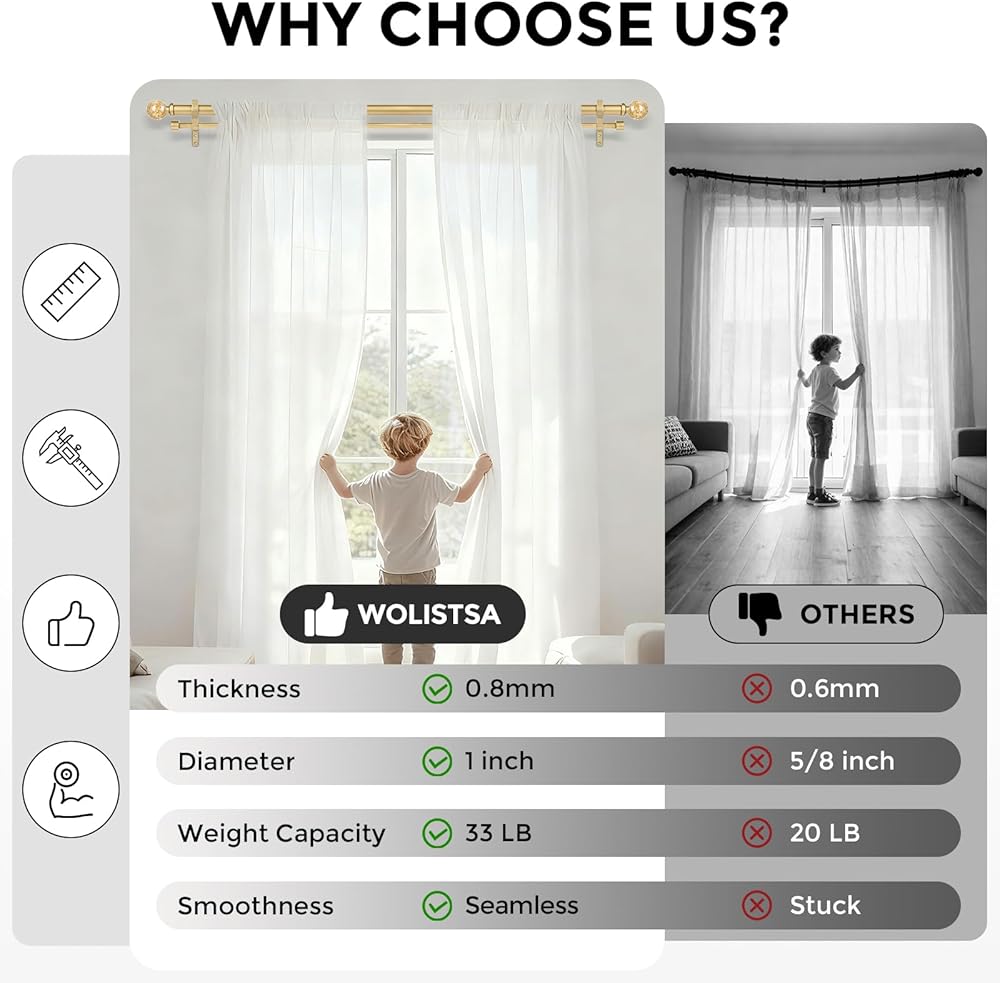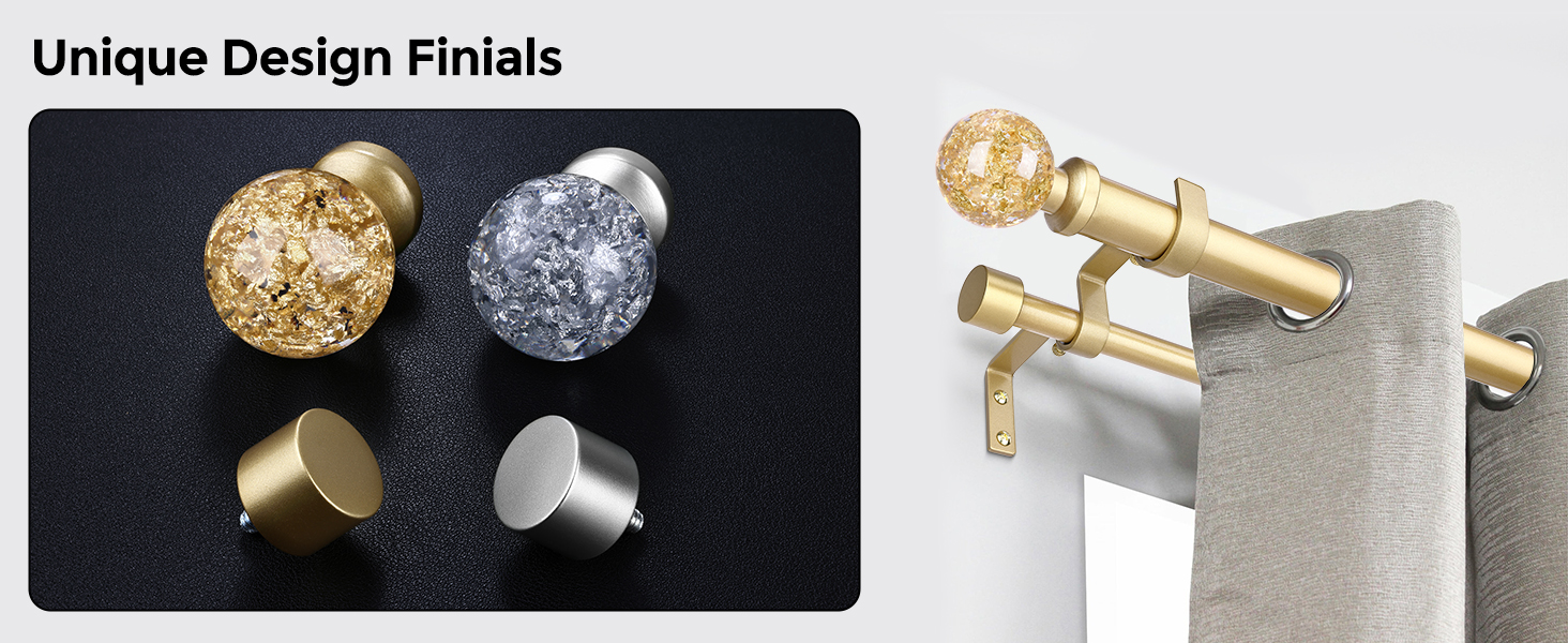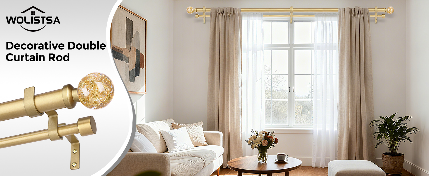 [GOLD DOUBLE CURTAIN ROD]: WOLISTSA double rod curtain rod is designed by professional designers, The front rod features transparent gold foil caps at both ends, creating a gorgeous and dazzling visual impact, while the rear rod is fitted with modern end caps for a sleek and elegant appearance. Perfect for farmhouses, bedrooms, living rooms, kitchens, sliding glass doors, dining rooms and patio decor