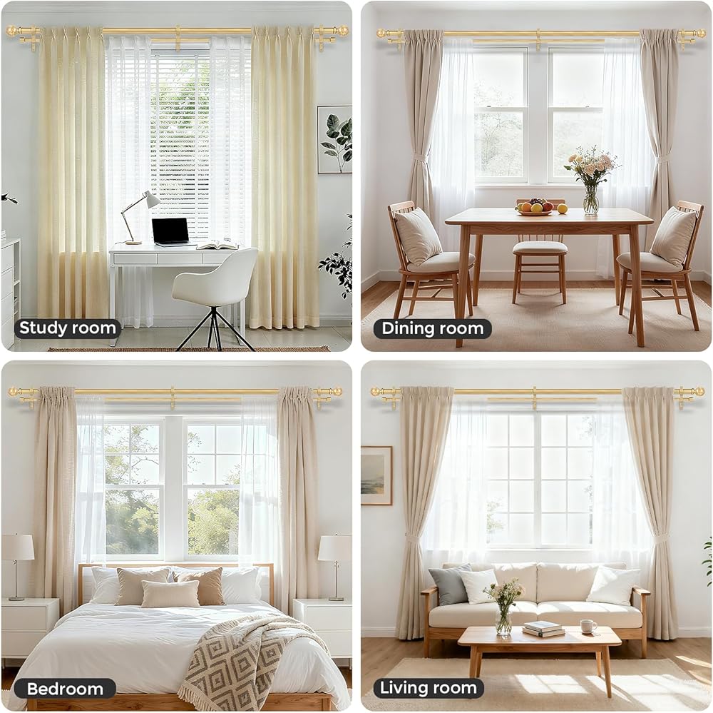 [TELESCOPING DOUBLE CURTAIN ROD]: Wolista decorative double curtain rods consist of multiple freely connectable sections and feature a single-side telescoping design. By rotating the connecting rod or extending one side, the length can be adjusted from 36 to 153 inches to accommodate windows of various sizes. The gold double curtain rod construction creates a layered look, which is great for grommet, back tab, rod pocket, and tab top curtains