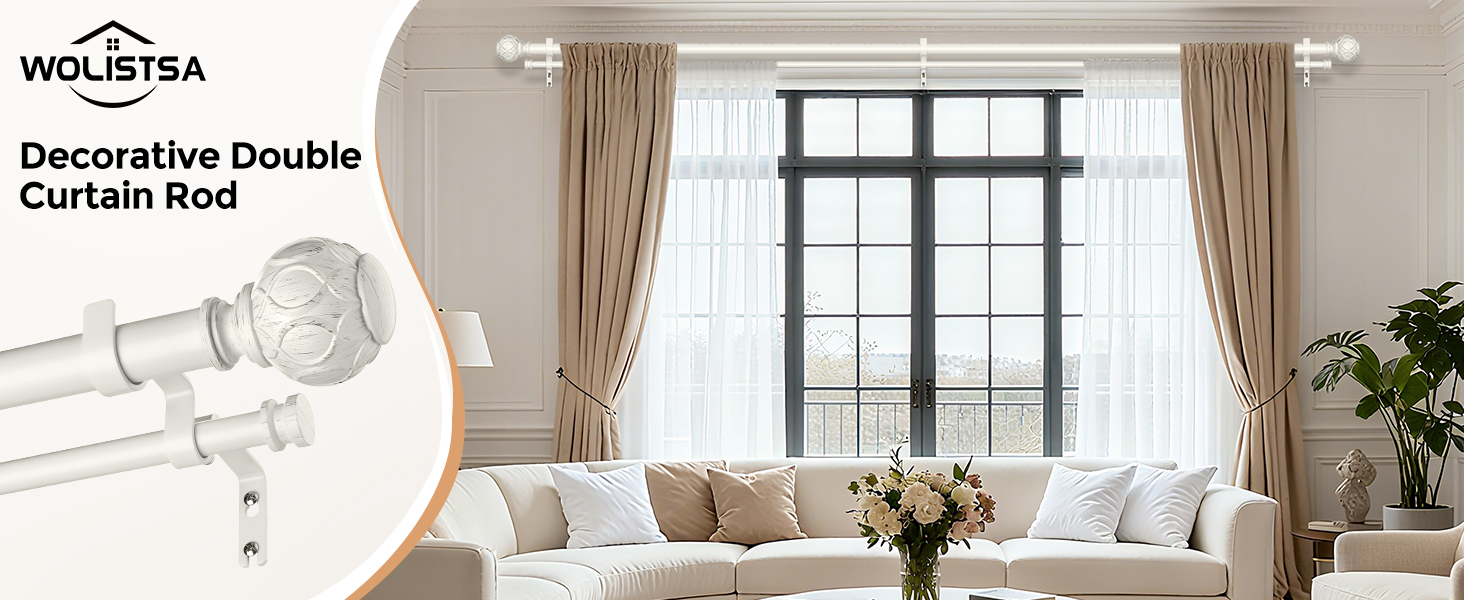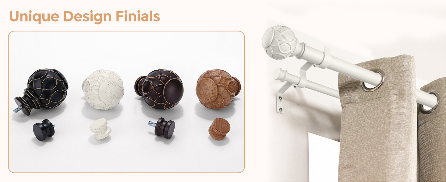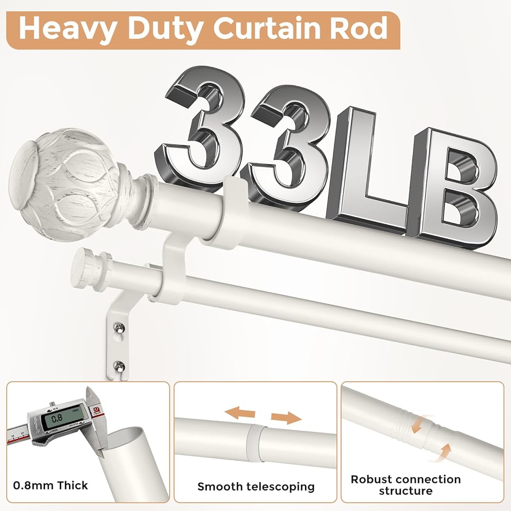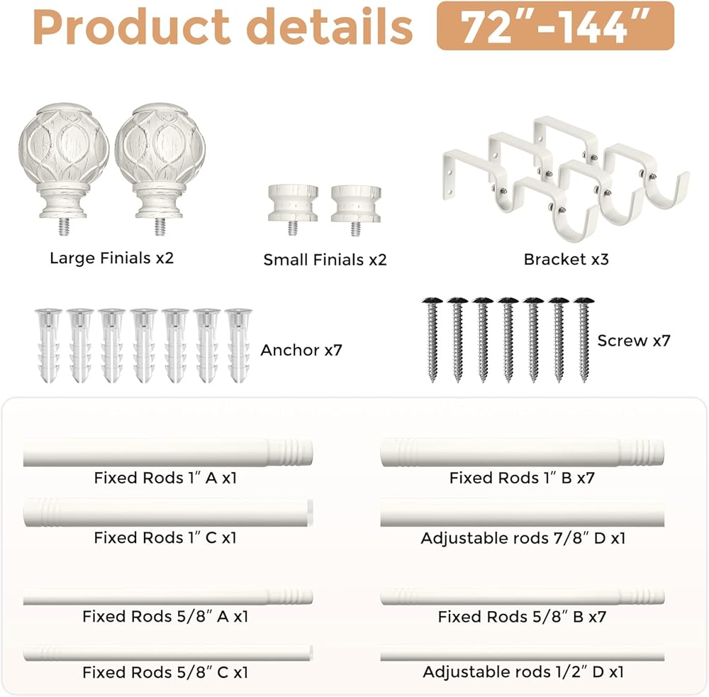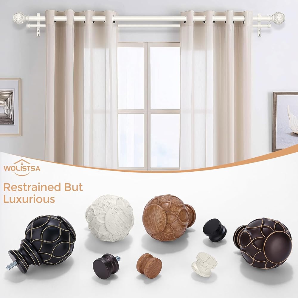 [ANTIQUE WHITE DOUBLE CURTAIN ROD]: Wolistsa double curtain rod decorated with netted texture finials designed by professional artistic master, infuse with classical motifs and imitation wood grain effect, exuding a vintage touch. Noble and classical without losing sturdiness and durability, instantly elevating rooms from basic to bespoke. Perfect for farmhouses, bedrooms, living rooms, kitchens, sliding glass doors, dining rooms and patio decor