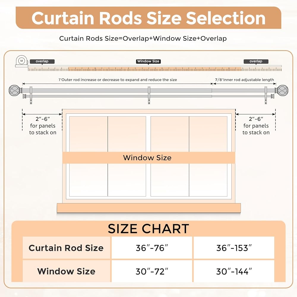 [DOUBLE CURTAIN ROD SIZE SELECTION]: The Wolistsa curtain rod double features a single side telescoping sliding construction, maximum extension length of 75.5 to 153 inches(7.6 to 12.75 feet), applicable window lengths from 69.5 to 149 inches(5.8 to 12.4 feet). This double window rod package includes 18 fixed rods, 2 adjustable telescopic rod, 4 netted texture finials, 3 brackets, 7 anchors, 7 screws