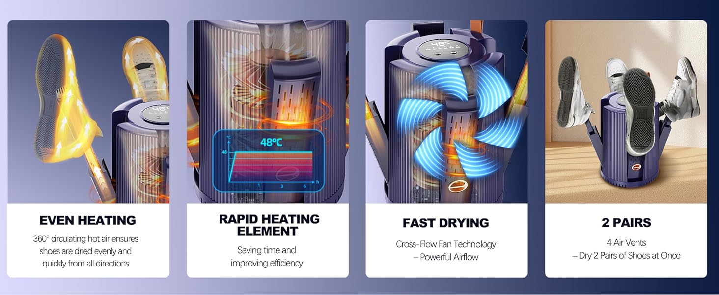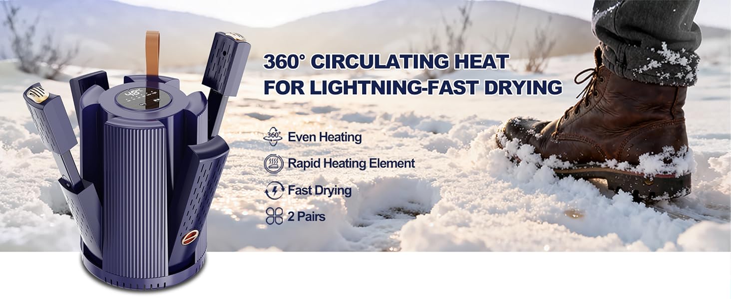 Rapid 360° Heat Circulation Dryer. The boot dryer features 360° circulating heat with a rapid heating element. The shoe dryer warms up quickly, uses warm air, and has dual circulating fans to quickly dry the inside of your footwear while helping prevent moisture buildup and overheating. Glove dryer with 4 air vents, designed to dry 2 pairs of shoes at once, saving time and improving efficiency by keeping your footwear dry and comfortable.