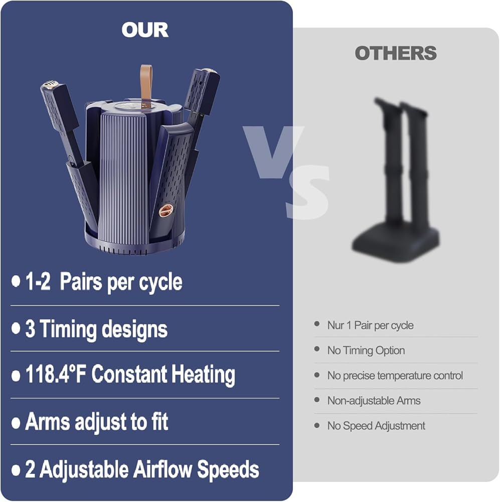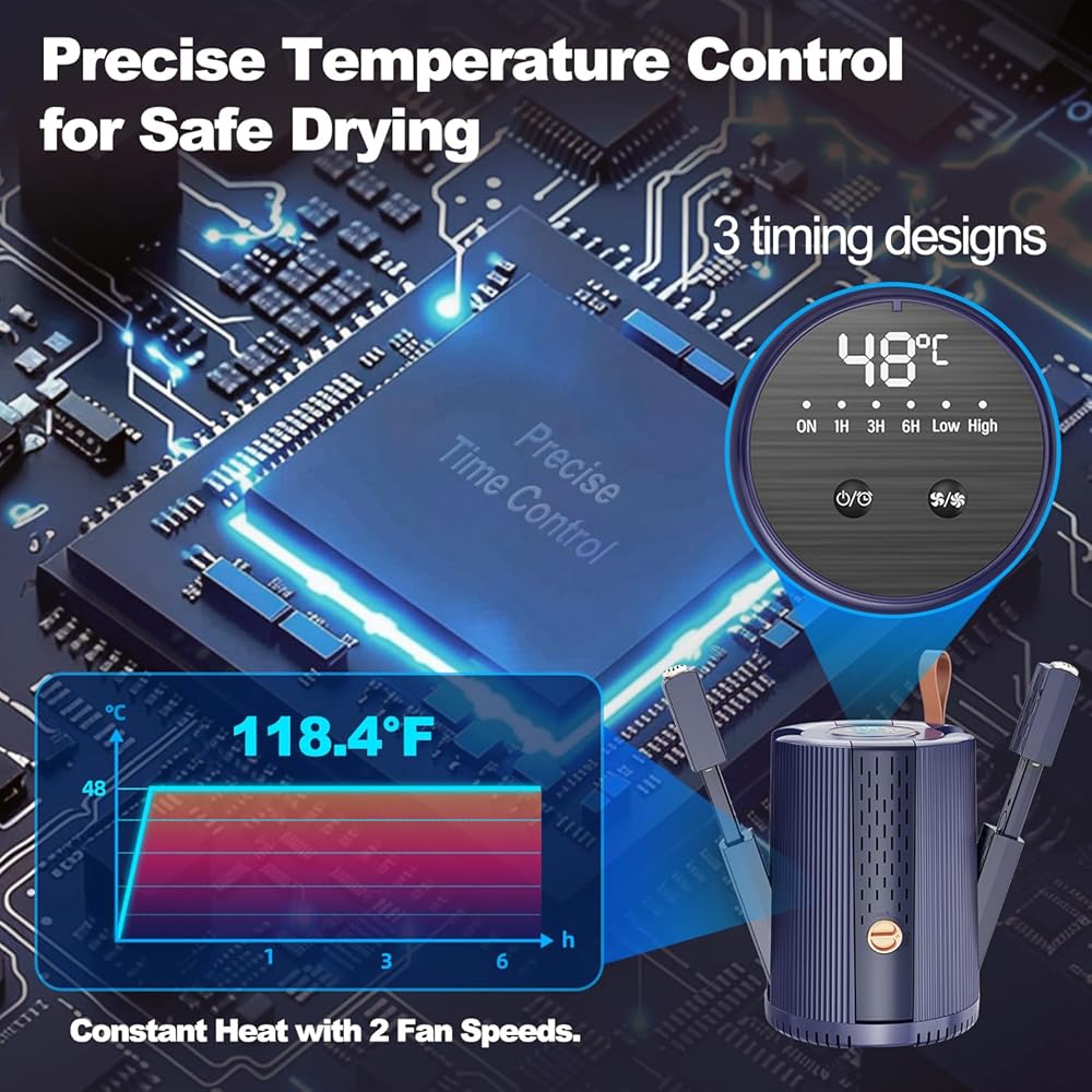 Customizable, Quiet & Overheat-Proof Drying. The digital timer and adjustable wind speed make it easy to customize drying times up to 6 hours, which saves energy and ensures everything dries just right. The double boot dryer is also whisper-quiet, so no annoying noise while it's running. The built-in constant temperature system maintains a stable drying temperature of 48°C (118°F) to ensure safe and effective drying without overheating.