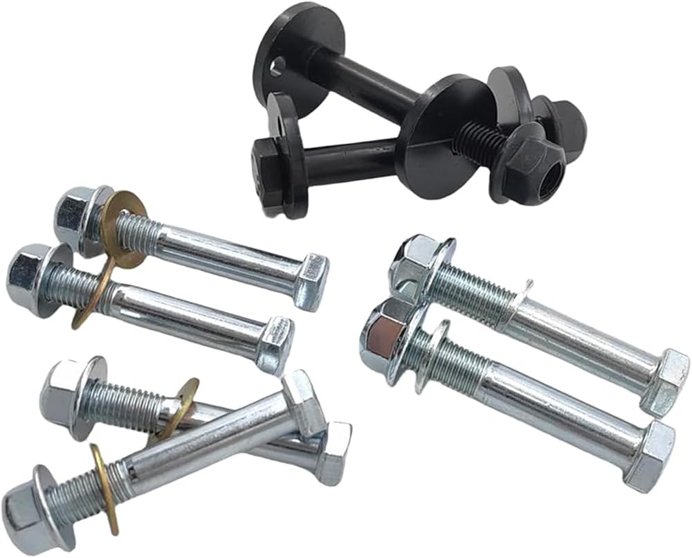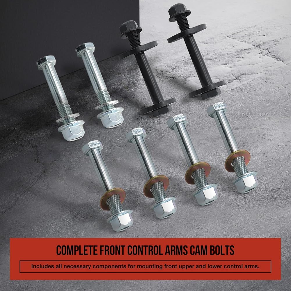 Complete Hardware Coverage: Includes all necessary components for securing front upper and lower control arms, such as cam bolts, cam washers, and nuts, covering both front and rear ends.