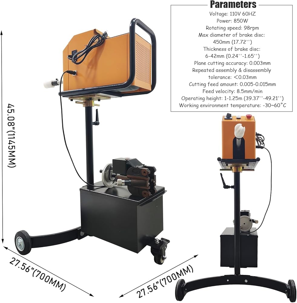 User-Friendly & Precision Control: This disc grinding tool featuring a simple control panel with clear indicators and an adjustable working height (1-1.25m/39-49 inches). Operators can easily set the cutting depth and rely on the steady 8.5mm/min auto feed and 98RPM operation for consistent, professional brake resurfacing results every time