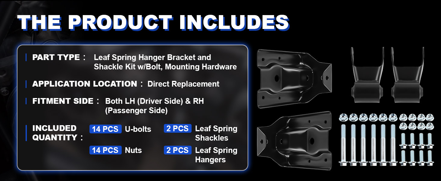Complete Kit: 2 x Upgrde Leaf spring hanger brackets; 2PCS x Shackles;Included Hardware: Bolt, Mounting Hardware as Shown