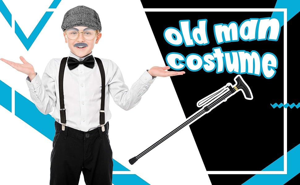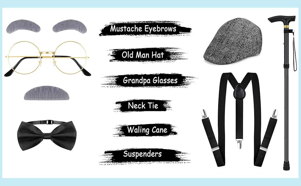 【What You Will Get】You will receive 1 piece of old men hat,a pair of glasses,1 set of false beards,a bow tie,a suspender and a piece of foldable cane,ideal combination for your old men costume,you can dress up with your friends, it seem to be the age of grandpa when you wear these funny old men costume accessories.