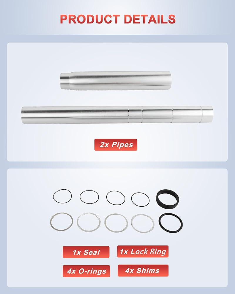 - Package Includes: 2x Pipes, 1x Seal, 1x Lock Ring, 4x Shims, 4x O-rings