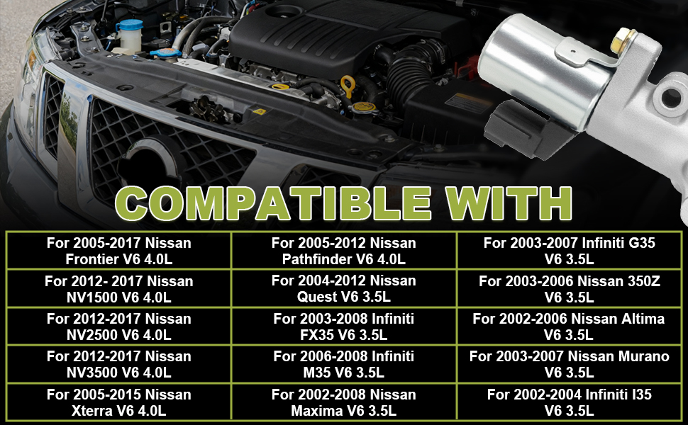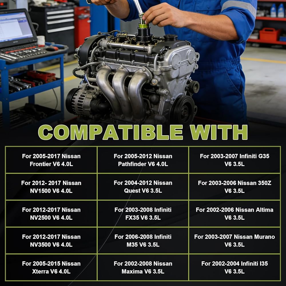 Compatibility -For 2005-2017 Nissan Frontier V6 4.0L; For 2012- 2017 Nissan NV1500 V6 4.0L; For 2012-2017 Nissan NV2500 V6 4.0L; For 2012-2017 Nissan NV3500 V6 4.0L; For 2005-2015 Nissan Xterra V6 4.0L; For 2005-2012 Nissan Pathfinder V6 4.0L; For 2004-2012 Nissan Quest V6 3.5L